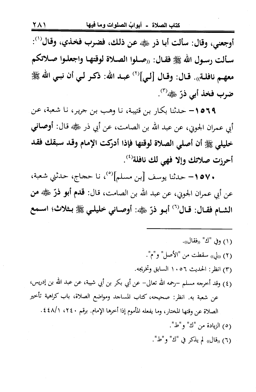 1569 - حدثنا بكار بن قتيبة، نا وهب بن جرير، نا شعبة، عن أبي عمران الجوني، عن عبد الله بن الصامت، عن أبي ذر -رضي الله عنه- قال: أوصاني خليلي -صلى الله عليه وسلم- أن أصلي الصلاة لوقتها فإذا أدركت الإمام وقد سبقك فقد أحرزت صلاتك وإلا فهي لك نافلة (¬1).