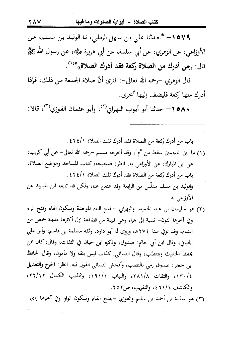 1579 - *حدثنا علي بن سهل الرملي، نا الوليد بن مسلم، عن الأوزاعي، عن الزهري، عن أبي سلمة، عن أبي هريرة -رضي الله عنه-، عن رسول الله -صلى الله عليه وسلم- قال: "من أدرك من الصلاة ركعة فقد أدرك الصلاة"* (¬1).