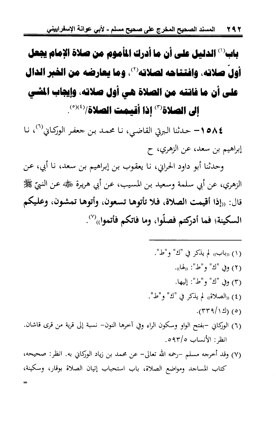وحدثنا أبو داود الحراني، نا يعقوب بن إبراهيم بن سعد، نا أبي، عن الزهري، عن أبي سلمة وسعيد بن المسيب، عن أبي هريرة -رضي الله عنه- عن النبي -صلى الله عليه وسلم- قال: "إذا أقيمت الصلاة، فلا تأتوها تسعون، وأتوها تمشون، وعليكم السكينة؛ فما أدركتم فصلّوا، وما فاتكم فأتموا" (¬2).