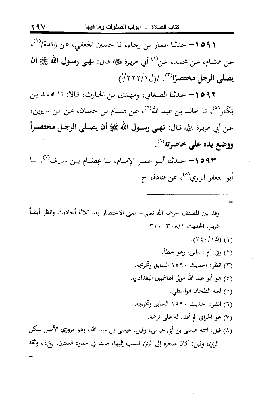 1591 - حدثنا عمار بن رجاء، نا حسين الجعفي، عن زائدة (¬1)، عن هشام، عن محمد، عن (¬2) أبي هريرة -رضي الله عنه- قال: نهى رسول الله -صلى الله عليه وسلم- أن يصلي الرجل مختصرًا (¬3).