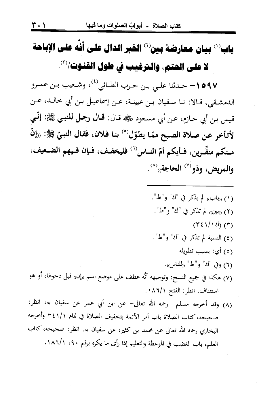 1597 - حدثنا علي بن حرب الطائي (¬1)، وشعيب بن عمرو الدمشقي، قالا: نا سفيان بن عيينة، عن إسماعيل بن أبي خالد، عن قيس بن أبي حازم، عن أبي مسعود -رضي الله عنه- قال: قال رجل للنبي -صلى الله عليه وسلم-: إنّي لأتأخر عن صلاة الصبح ممّا يطوّل (¬2) بنا فلان، فقال النبيّ -صلى الله عليه وسلم-: "إنّ منكم منفِّرين، فأيكم أمّ الناس (¬3) فليخفف، فإن فيهم الضعيف، والمريض، وذو (¬4) الحاجة" (¬5).