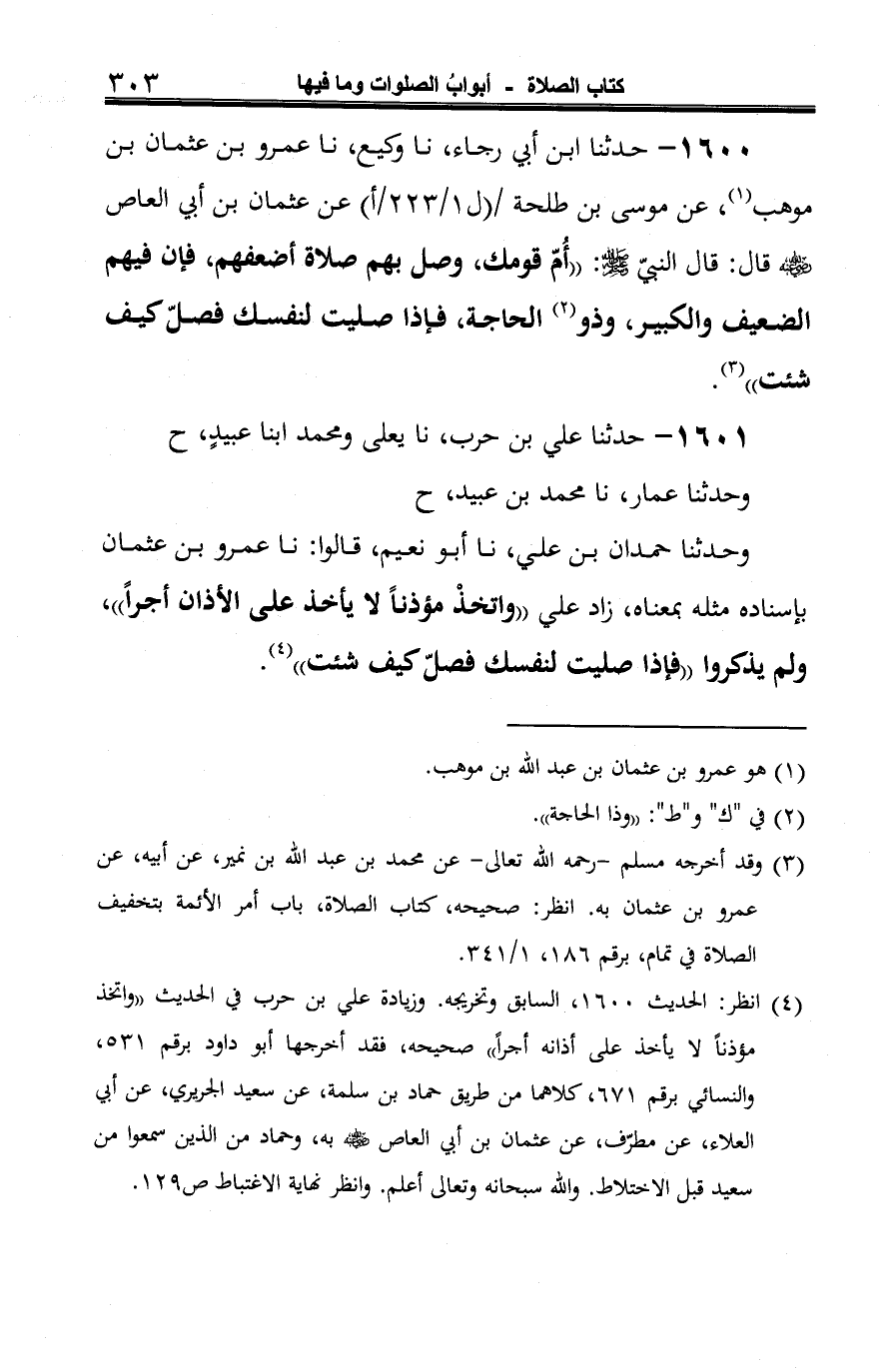 1600 - حدثنا ابن أبي رجاء، نا وكيع، نا عمرو بن عثمان بن موهب (¬1)، عن موسى بن طلحة عن عثمان بن أبي العاص -رضي الله عنه- قال: قال النبي -صلى الله عليه وسلم-: "أُمّ قومك، وصل بهم صلاة أضعفهم، فإن فيهم الضعيف والكبير، وذو (¬2) الحاجة، فإذا صليت لنفسك فصلّ كيف شئت" (¬3).