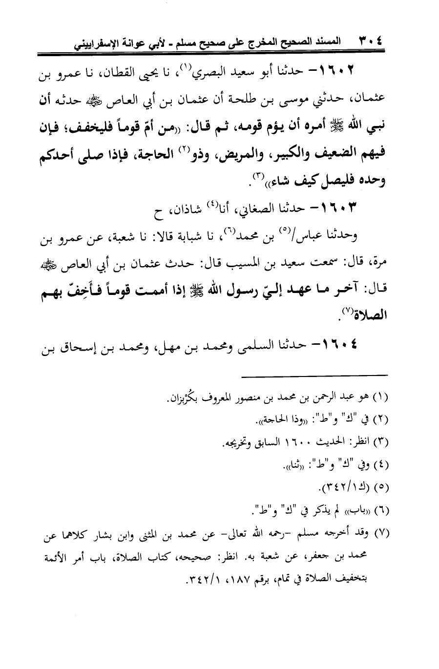 1602 - حدثنا أبو سعيد البصري (¬1)، نا يحيى القطان، نا عمرو بن عثمان، حدثني موسى بن طلحة أن عثمان بن أبي العاص -رضي الله عنه- حدثه أن نبي الله -صلى الله عليه وسلم- أمره أن يؤم قومه، ثم قال: "من أمّ قومًا فليخفف؛ فإن فيهم الضعيف والكبير، والمريض، وذو (¬2) الحاجة، فإذا صلى أحدكم وحده فليصل كيف شاء" (¬3).