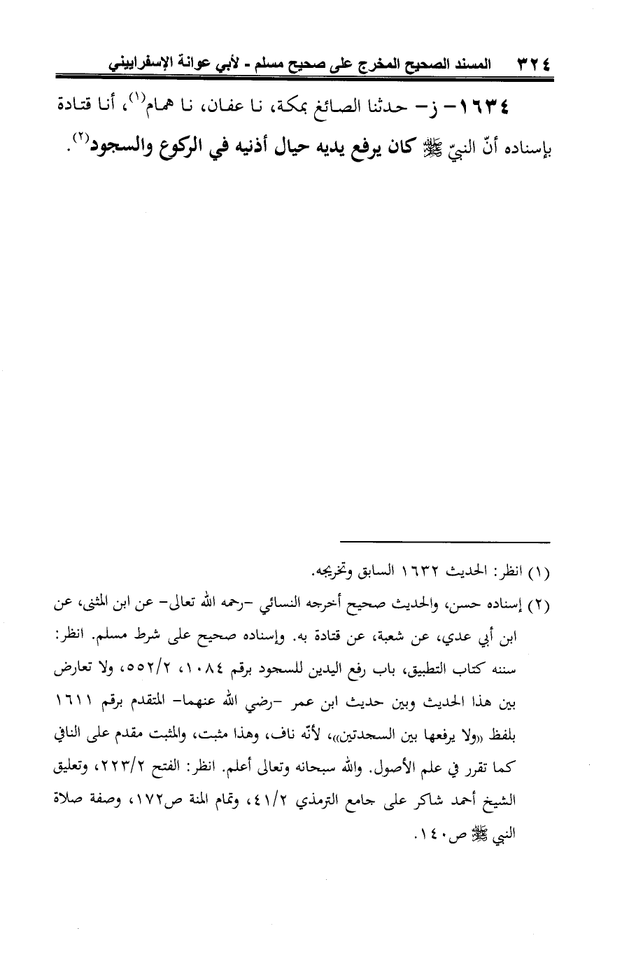 1634 - ز- حدثنا الصائغ بمكة، نا عفان، نا همام (¬1)، أنا قتادة بإسناده أنّ النبي -صلى الله عليه وسلم- كان يرفع يديه حيال أذنيه في الركوع والسجود (¬2).