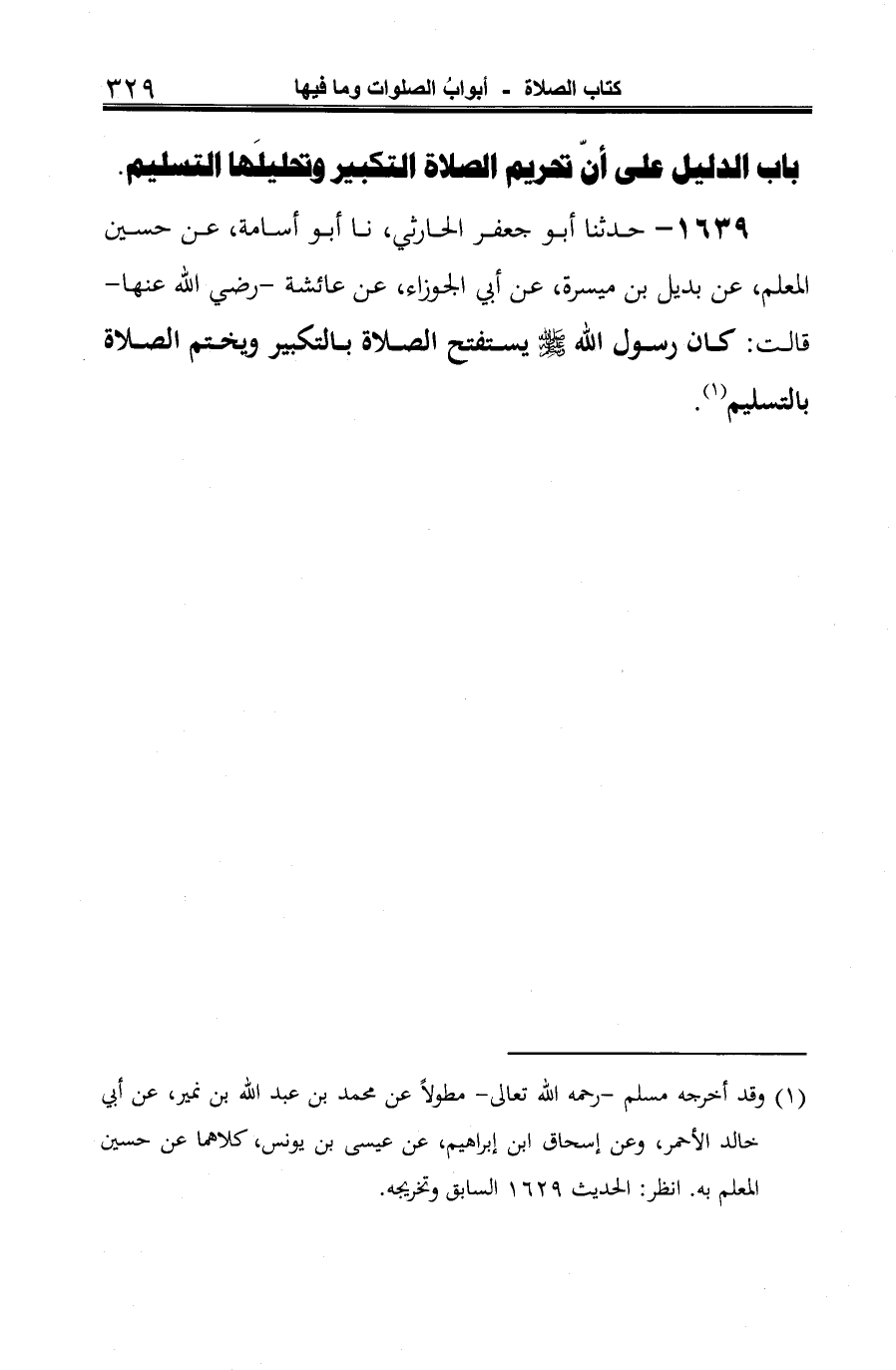 1639 - حدثنا أَبو جعفر الحارثي، نا أَبو أسامة، عن حسين المعلم، عن بديل بن ميسرة، عن أبي الجوزاء، عن عائشة -رضي الله عنها- قالت: كان رسول الله -صلى الله عليه وسلم- يستفتح الصلاة بالتكبير ويختم الصلاة بالتسليم (¬1).
