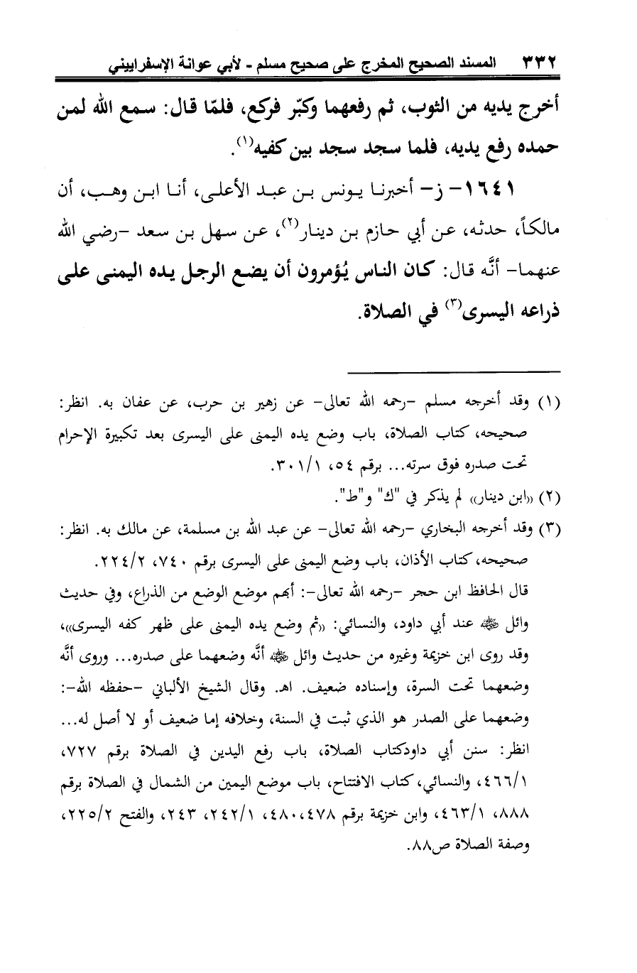 1641 - ز- أخبرنا يونس بن عبد الأعلى، أنا ابن وهب، أن مالكًا، حدثه، عن أبي حازم بن دينار (¬1)، عن سهل بن سعد -رضي الله عنهما- أنَّه قال: كان الناس يُؤمرون أن يضع الرجل يده اليمنى على ذراعه اليسرى (¬2) في الصلاة.