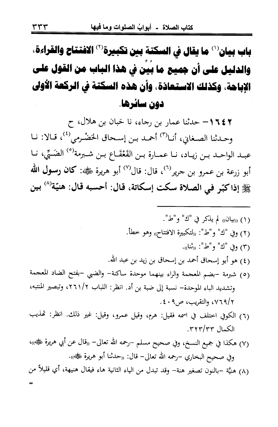 وحدثنا الصغاني، أنا (¬1) أحمد بن إسحاق الحَضْرمي (¬2)، قالا: نا عبد الواحد بن زياد، نا عمارة بن القَعْقَاع بن شبرمة (¬3) الضَبِّي، نا أَبو زرعة بن عمرو بن جرير (¬4)، قال: قال (¬5) أَبو هريرة -رضي الله عنه-: كان رسول الله -صلى الله عليه وسلم- إذا كبّر في الصلاة سكت إسكاتة، قال: أحسبه قال: هنيّة (¬6) بين