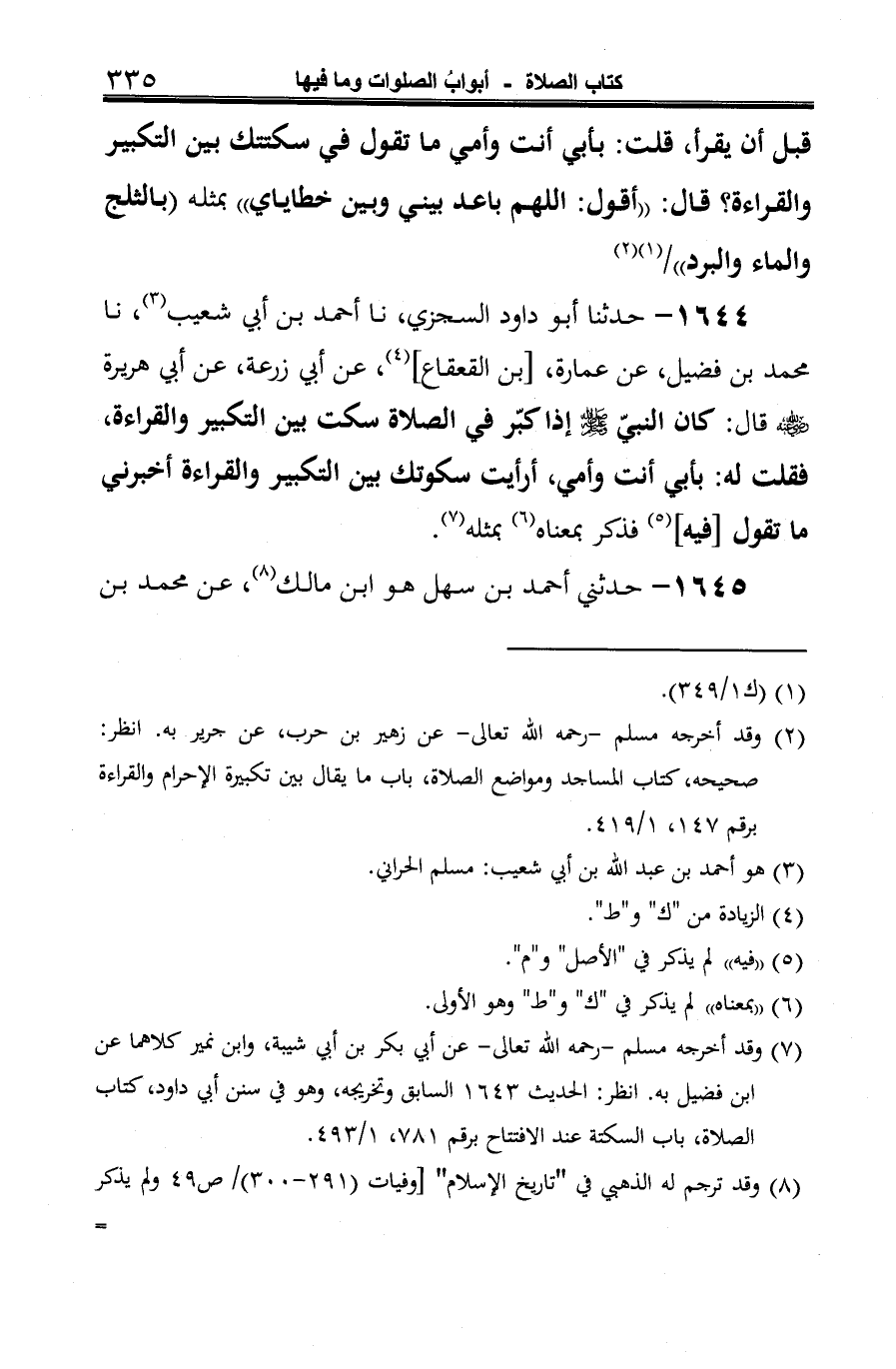 (¬5) وقد أخرجه مسلم -رحمه الله تعالى- عن أبي بكر بن أبي شيبة، وابن نمير كلاهما عن ابن فضيل به. انظر: الحديث 1643 السابق وتخريجه، وهو في سنن أبي داود، كتاب الصلاة، باب السكتة عند الافتتاح برقم 781، 1/ 493.