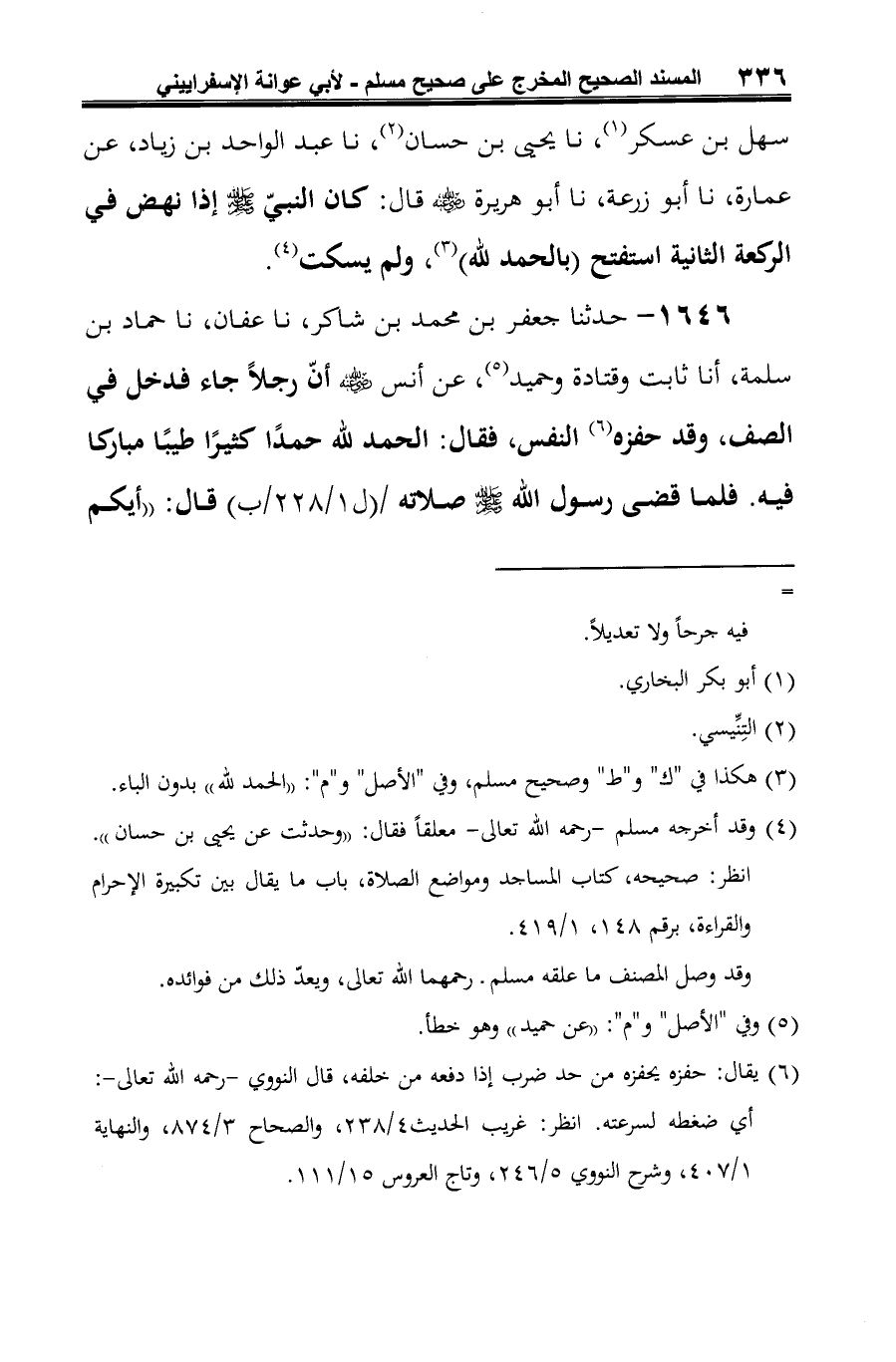 1646 - حدثنا جعفر بن محمد بن شاكر، نا عفان، نا حماد بن سلمة، أنا ثابت وقتادة وحميد (¬1)، عن أنس -رضي الله عنه- أنّ رجلًا جاء فدخل في الصف، وقد حفزه (¬2) النفس، فقال: الحمد لله حمدًا كثيرًا طيبًا مباركا فيه. فلما قضى رسول الله -صلى الله عليه وسلم- صلاته قال: "أيكم