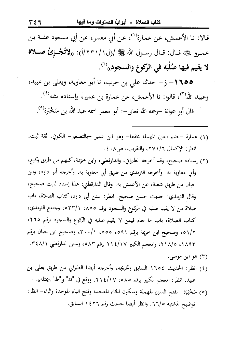 1655 - ز- حدثنا علي بن حرب، نا أَبو معاوية، ويعلى بن عبيد، وعبيد الله (¬1)، قالوا: نا الأعمش، عن عمارة بن عمير، بإسناده مثله (¬2).