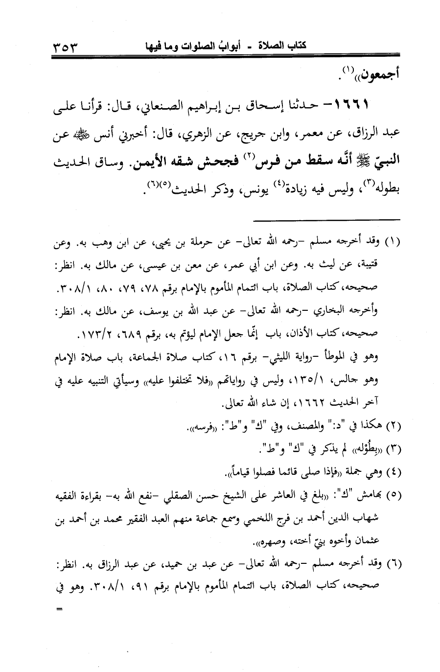 1661 - حدثنا إسحاق بن إبراهيم الصنعاني، قال: قرأنا على عبد الرزاق، عن معمر، وابن جريج، عن الزهري، قال: أخبرني أنس -رضي الله عنه- عن النبيّ -صلى الله عليه وسلم- أنَّه سقط من فرس (¬1) فجحش شقه الأيمن. وساق الحديث بطوله (¬2)، وليس فيه زيادة (¬3) يونس، وذكر الحديث (¬4) (¬5).
