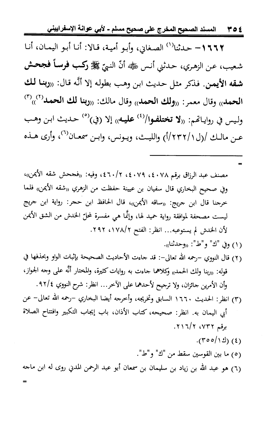 1662 - حدثنا (¬1) الصغاني، وأبو أمية، قالا: أنا أَبو اليمان، أنا شعيب، عن الزهري، حدثني أنس -رضي الله عنه- أنّ النبي -صلى الله عليه وسلم- ركب فرسًا فجحش شقه الأيمن. فذكر مثل حديث ابن وهب بطوله إلا أنَّه قال: "ربنا لك الحمد" وقال معمر: "ولك الحمد" وقال مالك: "ربنا لك الحمد (¬2) " (¬3). وليس في رواياتهم: "لا تختلفوا (¬4) عليه" إلا (في) (¬5) حديث ابن وهب عن مالك والليث، ويونس، وابن سمعان (¬6)، وأرى هذه