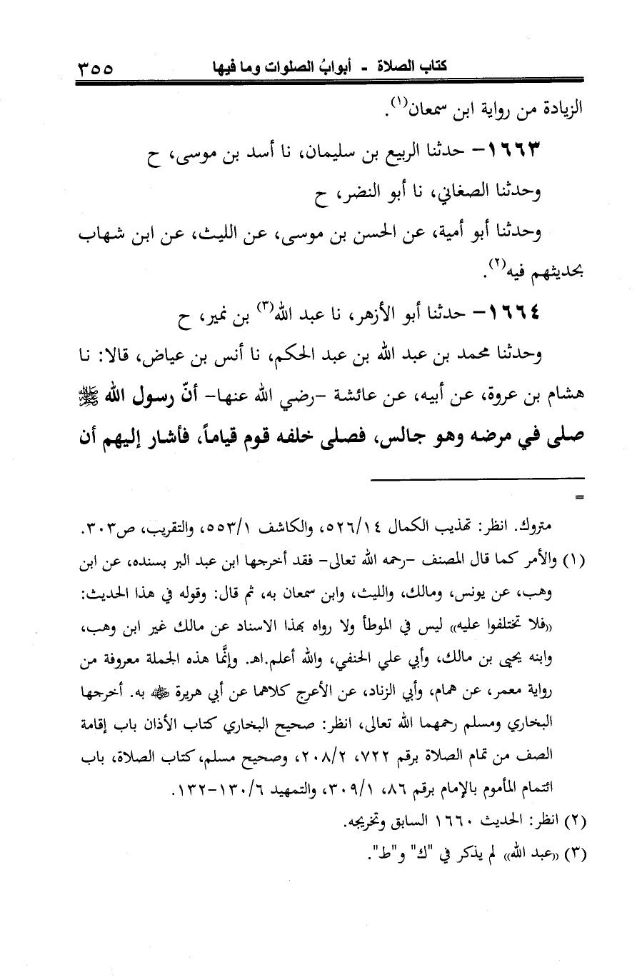 وحدثنا محمد بن عبد الله بن عبد الحكم، نا أنس بن عياض، قالا: نا هشام بن عروة، عن أبيه، عن عائشة -رضي الله عنها- أنّ رسول الله -صلى الله عليه وسلم -صلى في مرضه وهو جالس، فصلى خلفه قوم قيامًا، فأشار إليهم أن