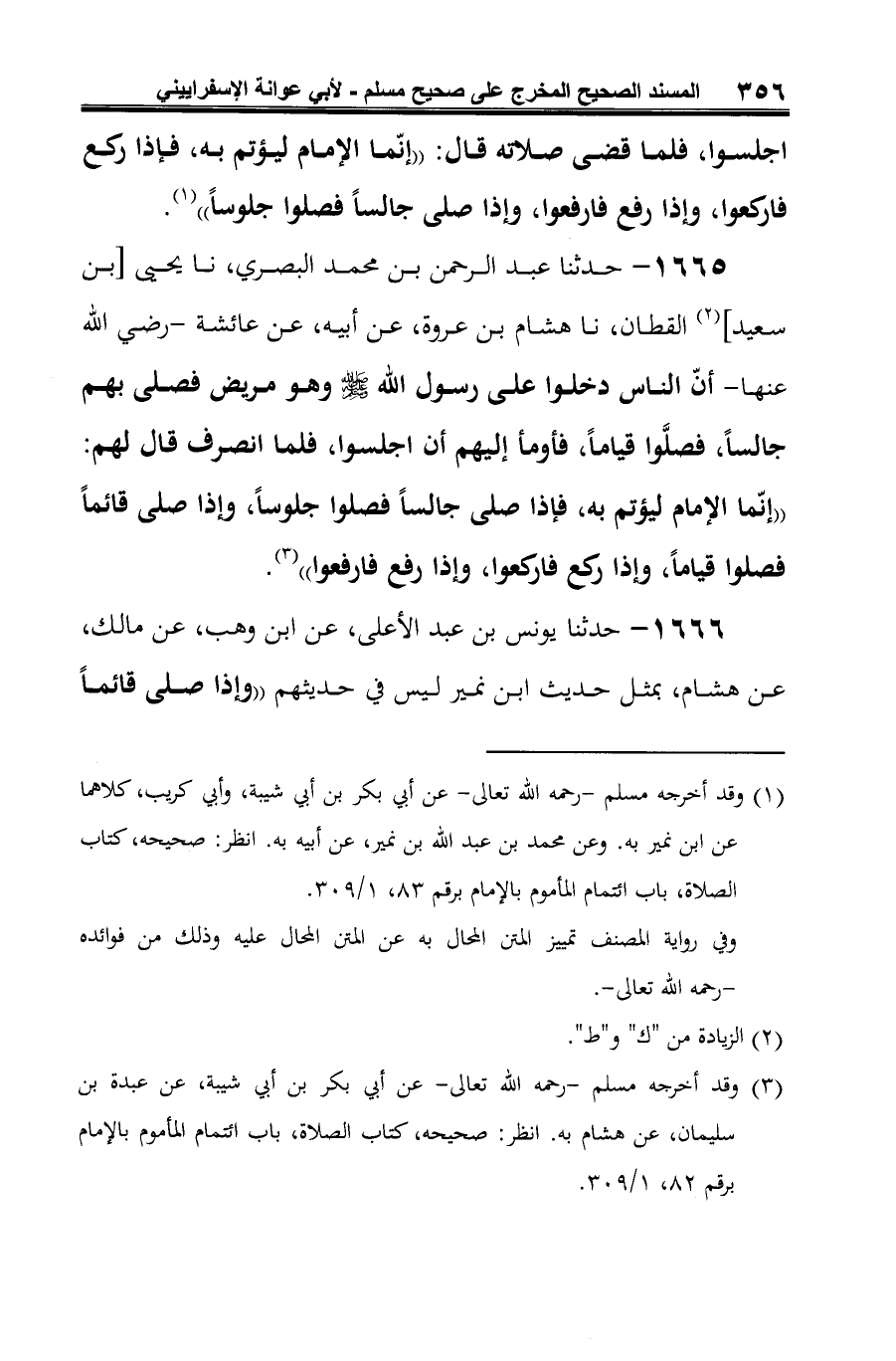(¬2) وقد أخرجه مسلم -رحمه الله تعالى- عن أبي بكر بن أبي شيبة، عن عبدة بن سليمان، عن هشام به. انظر: صحيحه، كتاب الصلاة، باب ائتمام المأموم بالإمام برقم 82، 1/ 309.