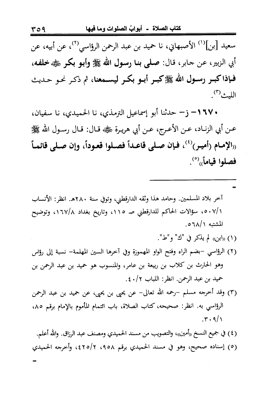 1670 - ز- حدثنا أَبو إسماعيل الترمذي، نا الحميدي، نا سفيان، عن أبي الزناد، عن الأعرج، عن أبي هريرة -رضي الله عنه- قال: قال رسول الله -صلى الله عليه وسلم- "الإمام (أمير) (¬1)، فإن صلى قاعدًا فصلوا قعودًا، وإن صلى قائمًا فصلوا قيامًا" (¬2).