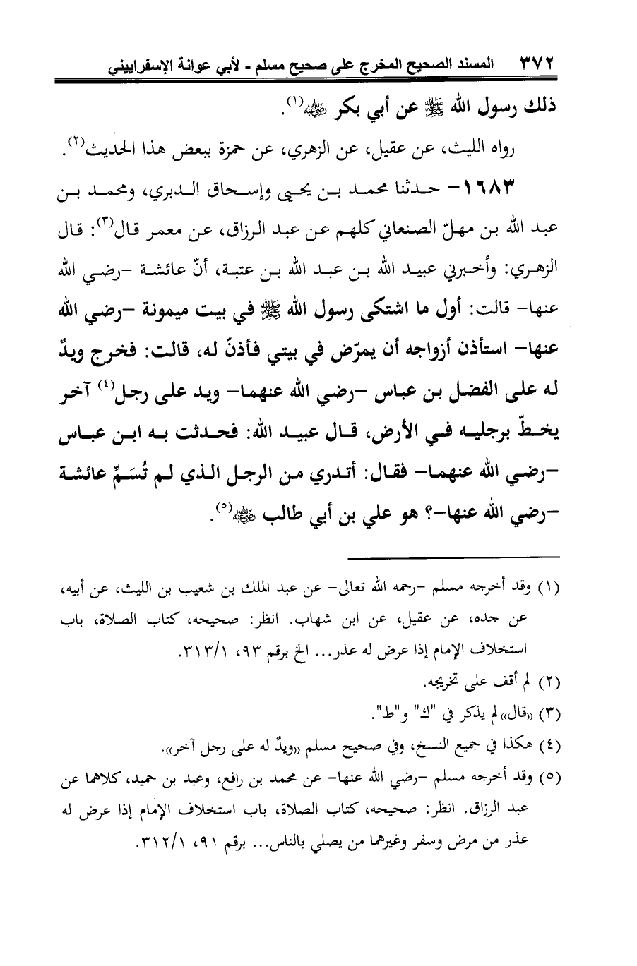 1683 - حدثنا محمد بن يحيى وإسحاق الدبري، ومحمد بن عبد الله بن مهلّ الصنعاني كلهم عن عبد الرزاق، عن معمر قال (¬1): قال الزهري: وأخبرني عبيد الله بن عبد الله بن عتبة، أنّ عائشة -رضي الله عنها- قالت: أول ما اشتكى رسول الله -صلى الله عليه وسلم- في بيت ميمونة -رضي الله عنها- استأذن أزواجه أن يمرّض في بيتي فأذنّ له، قالت: فخرج ويدٌ له على الفضل بن عباس -رضي الله عنهما- ويد على رجل (¬2) آخر يخطّ برجليه في الأرض، قال عبيد الله: فحدثت به ابن عباس -رضي الله عنهما- فقال: أتدري من الرجل الذي لم تُسَمِّ عائشة -رضي الله عنها-؟ هو علي بن أبي طالب -رضي الله عنه- (¬3).