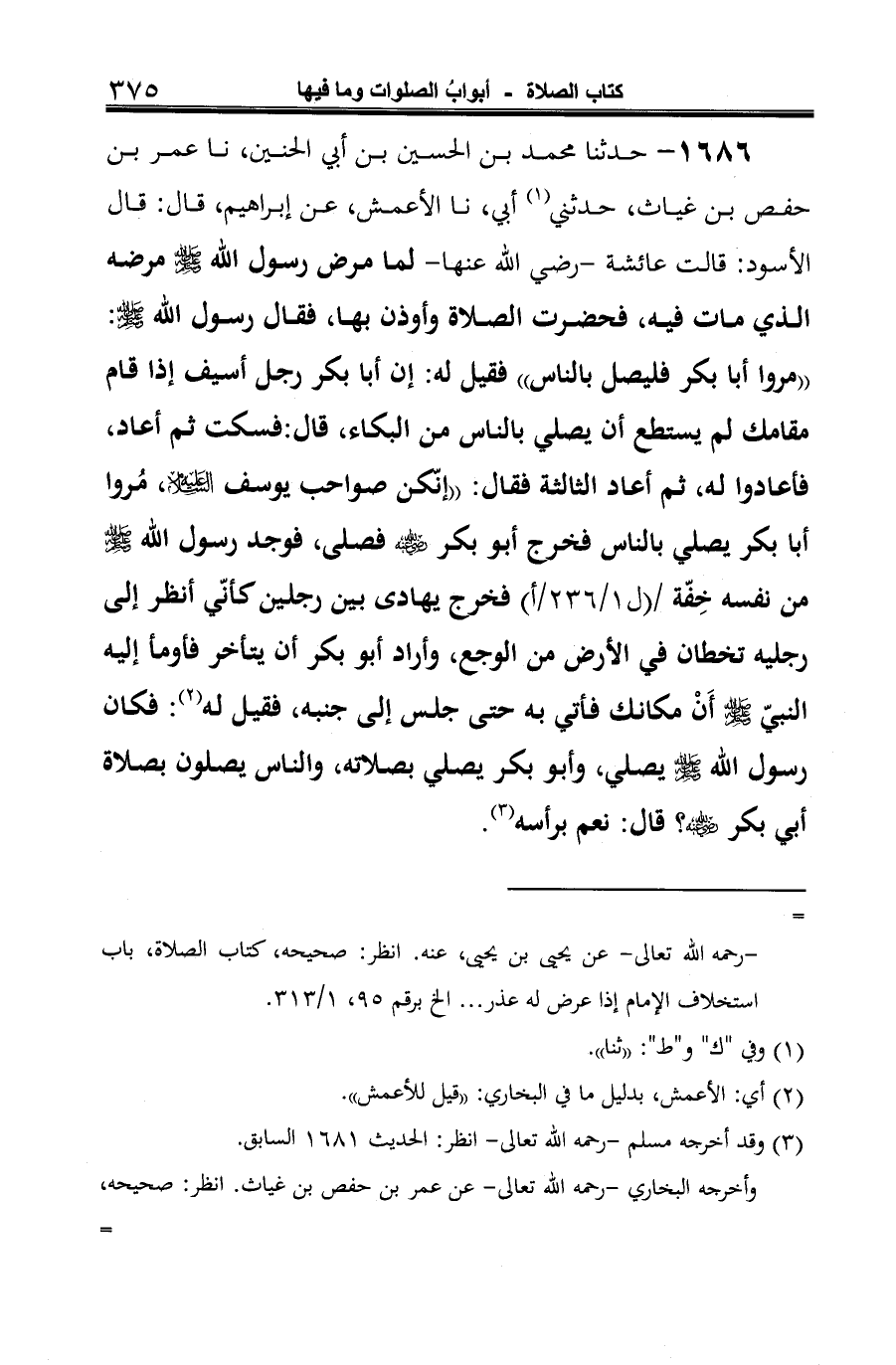 1686 - حدثنا محمد بن الحسين بن أبي الحنين، نا عمر بن حفص بن غياث، حدثني (¬1) أبي، نا الأعمش، عن إبراهيم، قال: قال الأسود: قالت عائشة -رضي الله عنها- لما مرض رسول الله -صلى الله عليه وسلم- مرضه الذي مات فيه، فحضرت الصلاة وأوذن بها، فقال رسول الله -صلى الله عليه وسلم-: "مروا أبا بكر فليصل بالناس" فقيل له: إن أبا بكر رجل أسيف إذا قام مقامك لم يستطع أن يصلي بالناس من البكاء، قال: فسكت ثم أعاد، فأعادوا له، ثم أعاد الثالثة فقال: "إنكن صواحب يوسف عليه السلام، مُروا أبا بكر يصلي بالناس فخرج أَبو بكر -رضي الله عنه- فصلى، فوجد رسول الله -صلى الله عليه وسلم- من نفسه خِفّة فخرج يهادى بين رجلين كأنّي أنظر إلى رجليه تخطان في الأرض من الوجع، وأراد أَبو بكر أن يتأخر فأومأ إليه النبيّ -صلى الله عليه وسلم- أَنْ مكانك فأتي به حتى جلس إلى جنبه، فقيل له (¬2): فكان رسول الله -صلى الله عليه وسلم- يصلي، وأبو بكر يصلي بصلاته، والناس يصلون بصلاة أبي بكر -رضي الله عنه-؟ قال: نعم برأسه (¬3).
