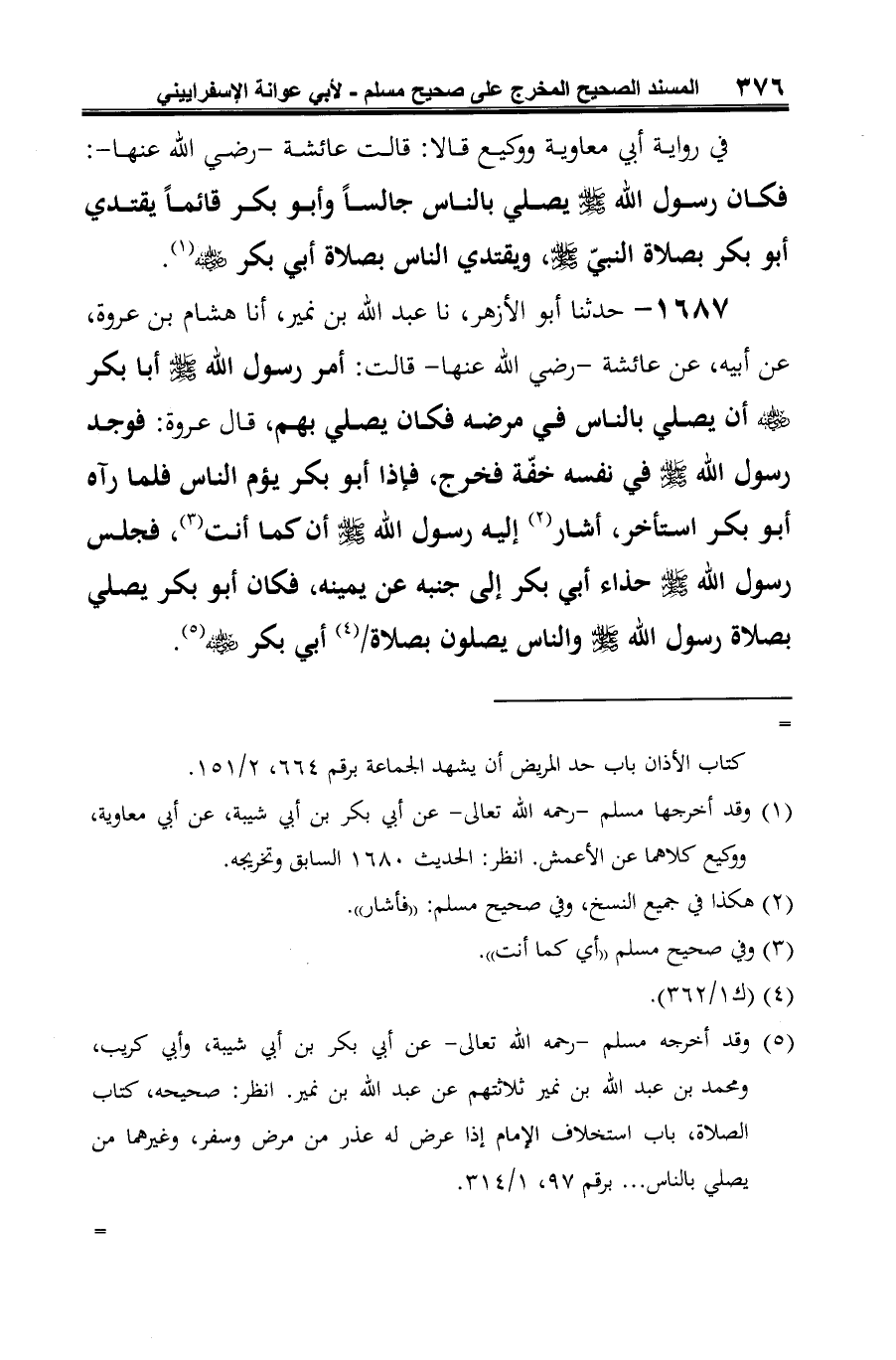 (¬4) وقد أخرجه مسلم -رحمه الله تعالى- عن أبي بكر بن أبي شيبة، وأبي كريب، ومحمد بن عبد الله بن نمير ثلاثتهم عن عبد الله بن نمير. انظر: صحيحه، كتاب الصلاة، باب استخلاف الإمام إذا عرض له عذر من مرض وسفر، وغيرهما من يصلي بالناس ... برقم 97، 1/ 314. =