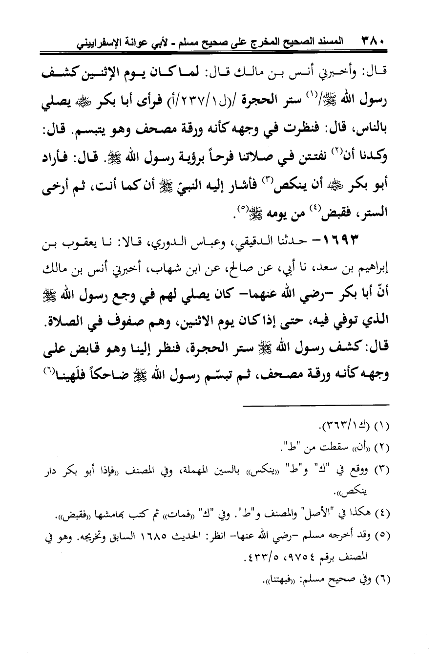1693 - حدثنا الدقيقي، وعباس الدوري، قالا: نا يعقوب بن إبراهيم بن سعد، نا أبي، عن صالح، عن ابن شهاب، أخبرني أنس بن مالك أنّ أبا بكر -رضي الله عنهما- كان يصلي لهم في وجع رسول الله -صلى الله عليه وسلم- الذي توفي فيه، حتى إذا كان يوم الإثنين، وهم صفوف في الصلاة. قال: كشف رسول الله -صلى الله عليه وسلم- ستر الحجرة، فنظر إلينا وهو قابض على وجهه كأنه ورقة مصحف، ثم تبسّم رسول الله -صلى الله عليه وسلم- ضاحكًا فلَهينا (¬1)
