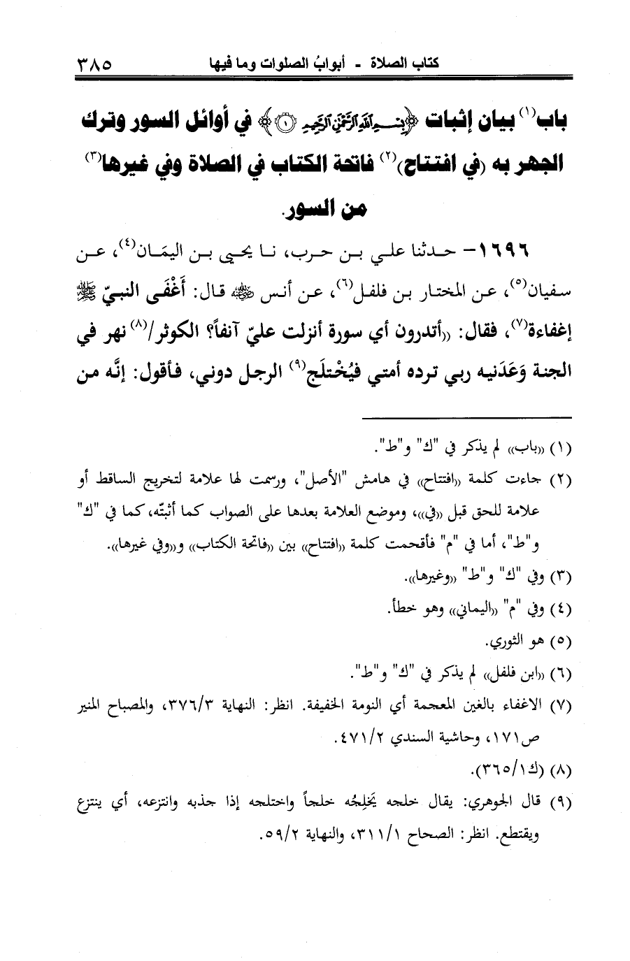 1696 - حدثنا علي بن حرب، نا يحيى بن اليمَان (¬1)، عن سفيان (¬2)، عن المختار بن فلفل (¬3)، عن أنس -رضي الله عنه- قال: أَغْفَى النبيّ -صلى الله عليه وسلم- إغفاءة (¬4)، فقال: "أتدرون أي سورة أنزلت عليّ آنفًا؟ الكوثر (¬5) نهر في الجنة وَعَدَنيه ربي ترده أمتي فيُخْتلَج (¬6) الرجل دوني، فأقول: إنَّه من