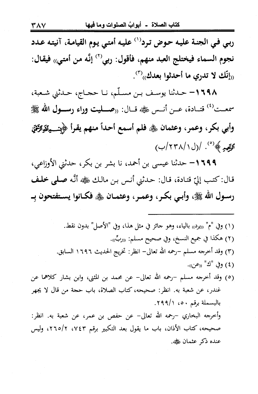 (¬2) وقد أخرجه مسلم -رحمه الله تعالى- عن محمد بن المثنى، وابن بشار كلاهما عن غندر، عن شعبة به. انظر: صحيحه، كتاب الصلاة، باب حجة من قال لا يجهر بالبسملة برقم 50، 1/ 299.