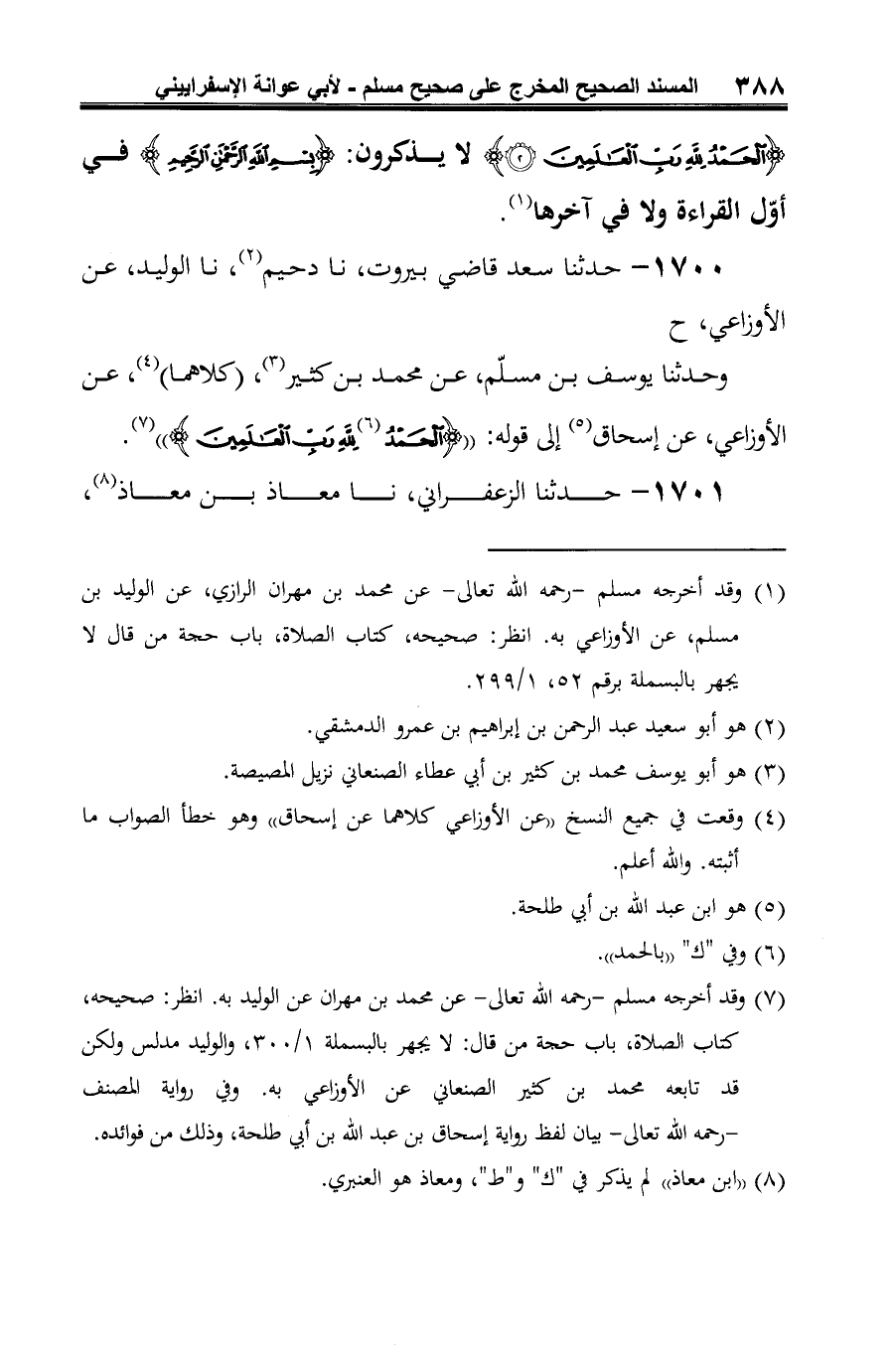 (¬6) وقد أخرجه مسلم -رحمه الله تعالى- عن محمد بن مهران عن الوليد به. انظر: صحيحه، كتاب الصلاة، باب حجة من قال: لا يجهر بالبسملة 1/ 300، والوليد مدلس ولكن قد تابعه محمد بن كثير الصنعاني عن الأوزاعي به. وفي رواية المصنف -رحمه الله تعالى- بيان لفظ رواية إسحاق بن عبد الله بن أبي طلحة، وذلك من فوائده.