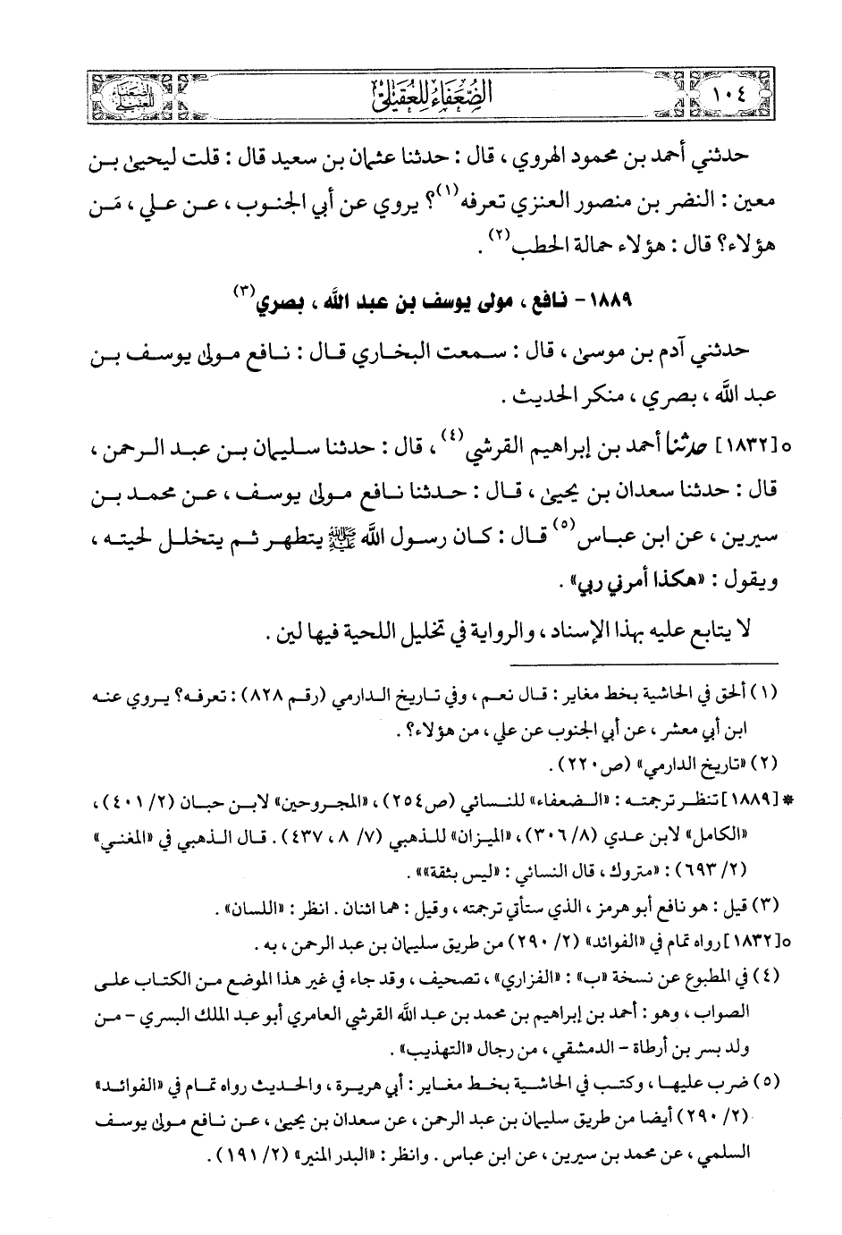 (3) * [1889] تنظر ترجمته: «الضعفاء» للنسائي (ص254) , «المجروحين» لابن حبان (2/ 401) , «الكامل» لابن عدي (8/ 306) , «الميزان» للذهبي (7/ 8، 437). قال الذهبي في «المغني» (2/ 693): «متروك، قال النسائي: «ليس بثقة»».