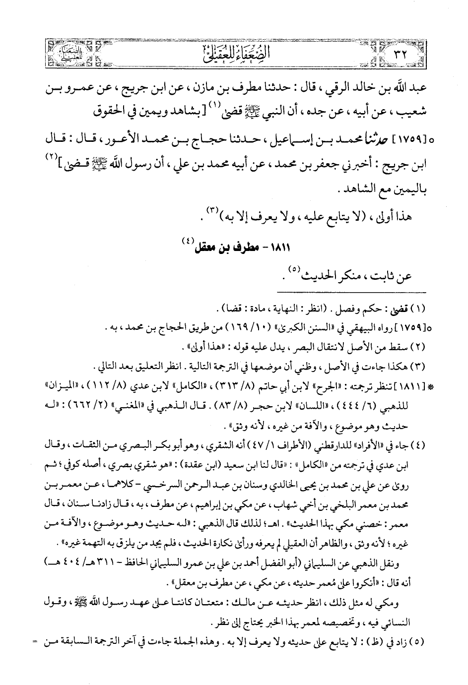 (6) جاء في «الأفراد» للدارقطني (الأطراف 1/ 47) أنه الشقري، وهو أبو بكر البصري من الثقات، وقال ابن عدي في ترجمته من «الكامل»: «قال لنا ابن سعيد (ابن عقدة): «هو شقري بصري، أصله كوفي؛ ثم روى عن علي بن محمد بن يحيى الخالدي وسنان بن عبد الرحمن السرخسي - كلاهما، عن معمر بن محمد بن معمر البلخي بن أخي شهاب، عن مكي بن إبراهيم، عن مطرف، به، قال زادنا سنان، قال معمر: خصني مكي بهذا الحديث». اهـ؛ لذلك قال الذهبي: «له حديث وهو موضوع، والآفة من غيره؛ لأنه وثق، والظاهر أن العقيلي لم يعرفه ورأى نكارة الحديث، فلم يجد من يلزق به التهمة غيره».