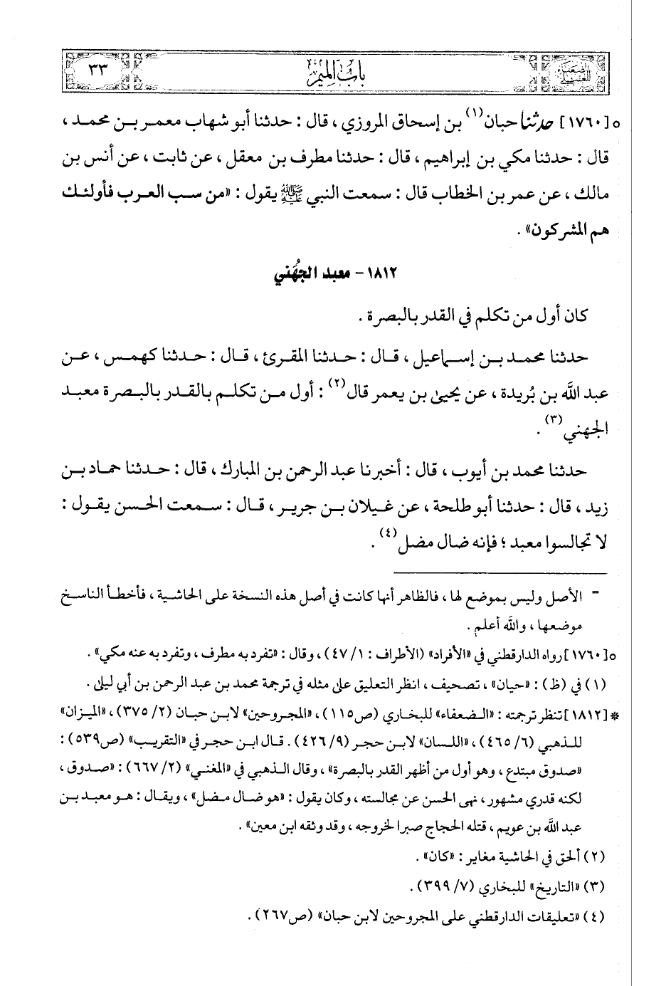 (3) * [1812] تنظر ترجمته: «الضعفاء» للبخاري (ص115) , «المجروحين» لابن حبان (2/ 375) , «الميزان» للذهبي (6/ 465) , «اللسان» لابن حجر (9/ 426). قال ابن حجر في «التقريب» (ص539): «صدوق مبتدع، وهو أول من أظهر القدر بالبصرة» , وقال الذهبي في «المغني» (2/ 667): «صدوق، لكنه قدري مشهور، نهى الحسن عن مجالسته، وكان يقول: «هو ضال مضل»، ويقال: هو معبد بن عبد الله بن عويم، قتله الحجاج صبرا لخروجه، وقد وثقه ابن معين».