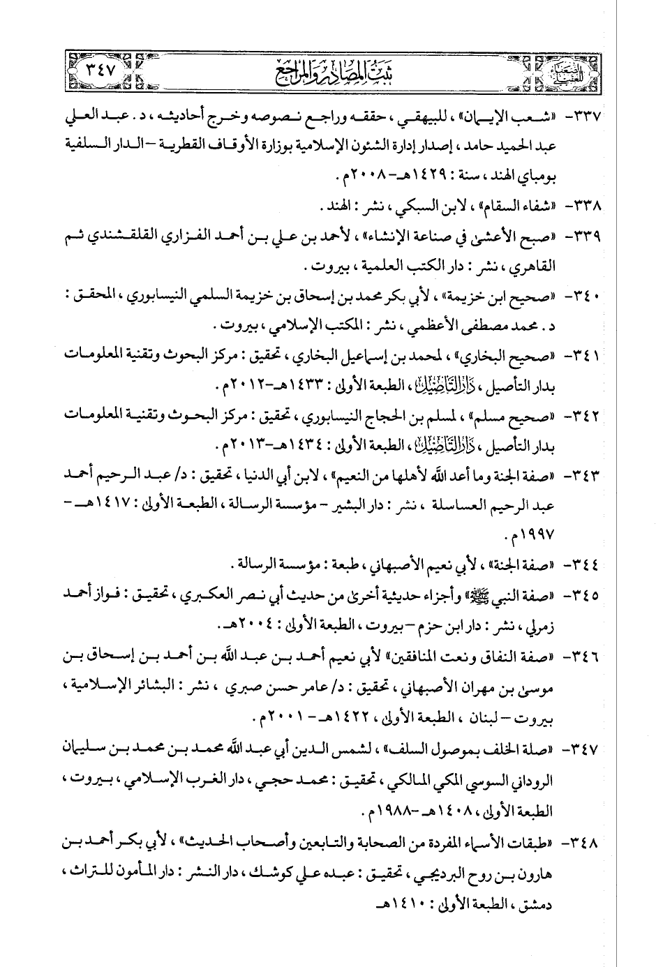 337 - «شعب الإيمان»، للبيهقي، حققه وراجع نصوصه وخرج أحاديثه، د. عبد العلي عبد الحميد حامد، إصدار إدارة الشئون الإسلامية بوزارة الأوقاف القطرية – الدار السلفية بومباي الهند، سنة: 1429هـ- 2008م.