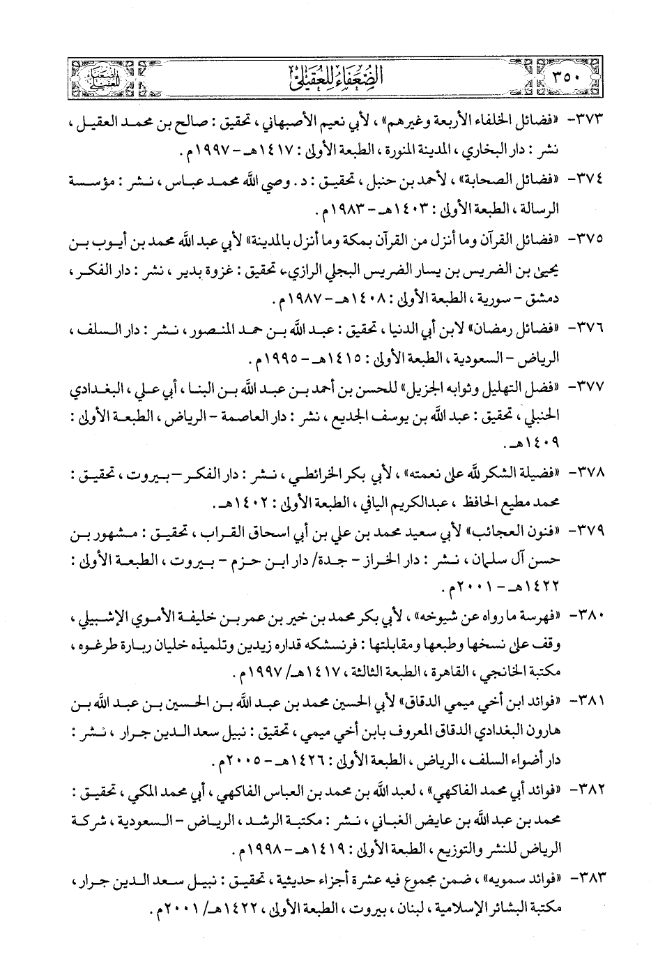 373 - «فضائل الخلفاء الأربعة وغيرهم»، لأبي نعيم الأصبهاني، تحقيق: صالح بن محمد العقيل، نشر: دار البخاري، المدينة المنورة، الطبعة الأولى: 1417هـ - 1997م.