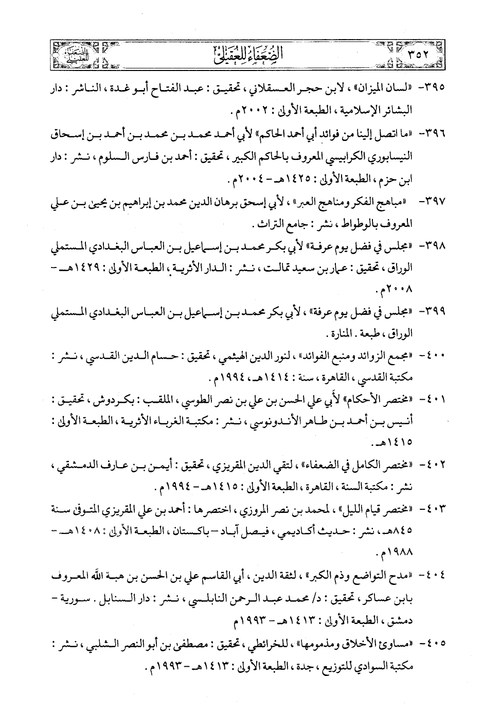 402 - «مختصر الكامل في الضعفاء»، لتقي الدين المقريزي، تحقيق: أيمن بن عارف الدمشقي، نشر: مكتبة السنة، القاهرة، الطبعة الأولى: 1415هـ - 1994م.