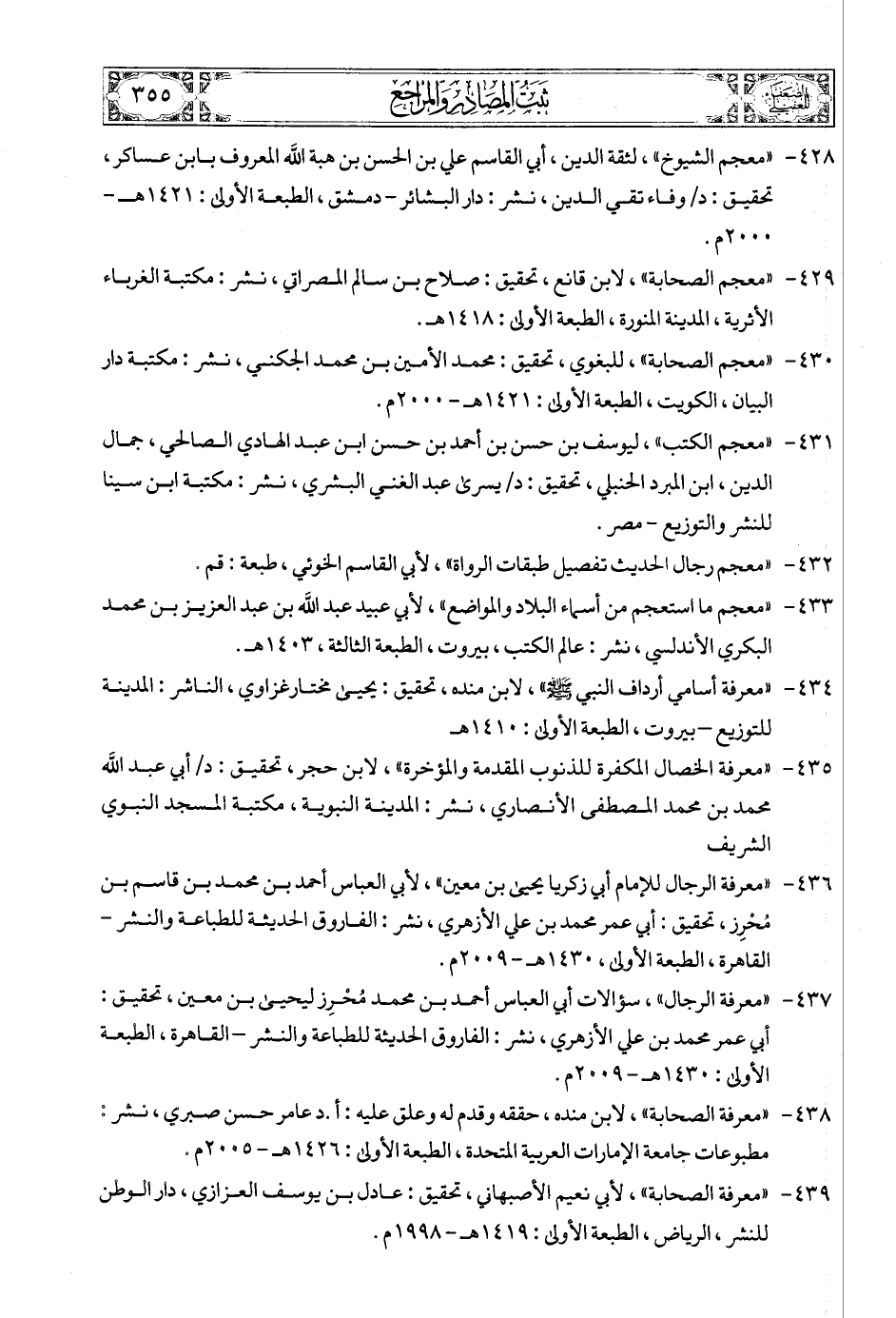 431 - «معجم الكتب»، ليوسف بن حسن بن أحمد بن حسن ابن عبد الهادي الصالحي، جمال الدين، ابن المبرد الحنبلي، تحقيق: د/يسرى عبد الغني البشري، نشر: مكتبة ابن سينا للنشر والتوزيع - مصر.
