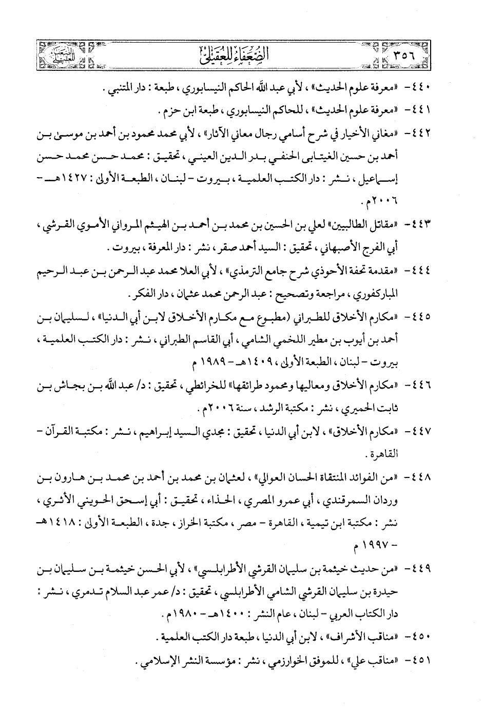 446 - «مكارم الأخلاق ومعاليها ومحمود طرائقها» للخرائطي، تحقيق: د/عبد الله بن بجاش بن ثابت الحميري، نشر: مكتبة الرشد، سنة 2006م.