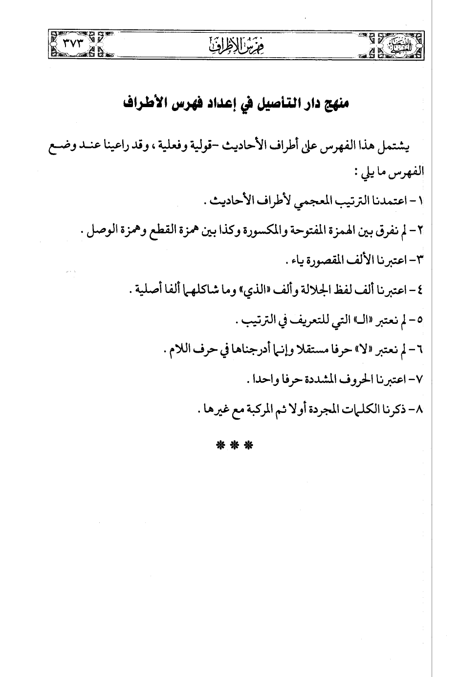 يشتمل هذا الفهرس على أطراف الأحاديث -قولية وفعلية، وقد راعينا عند وضع الفهرس ما يلي:
