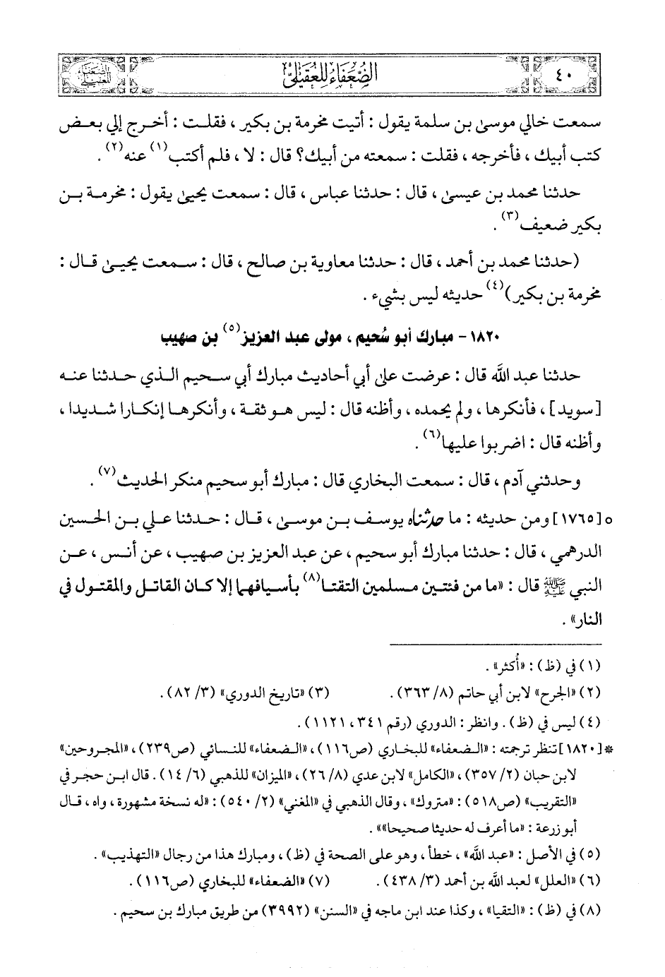 (6) في الأصل: «عبد الله»، خطأ، وهو على الصحة في (ظ)، ومبارك هذا من رجال «التهذيب».