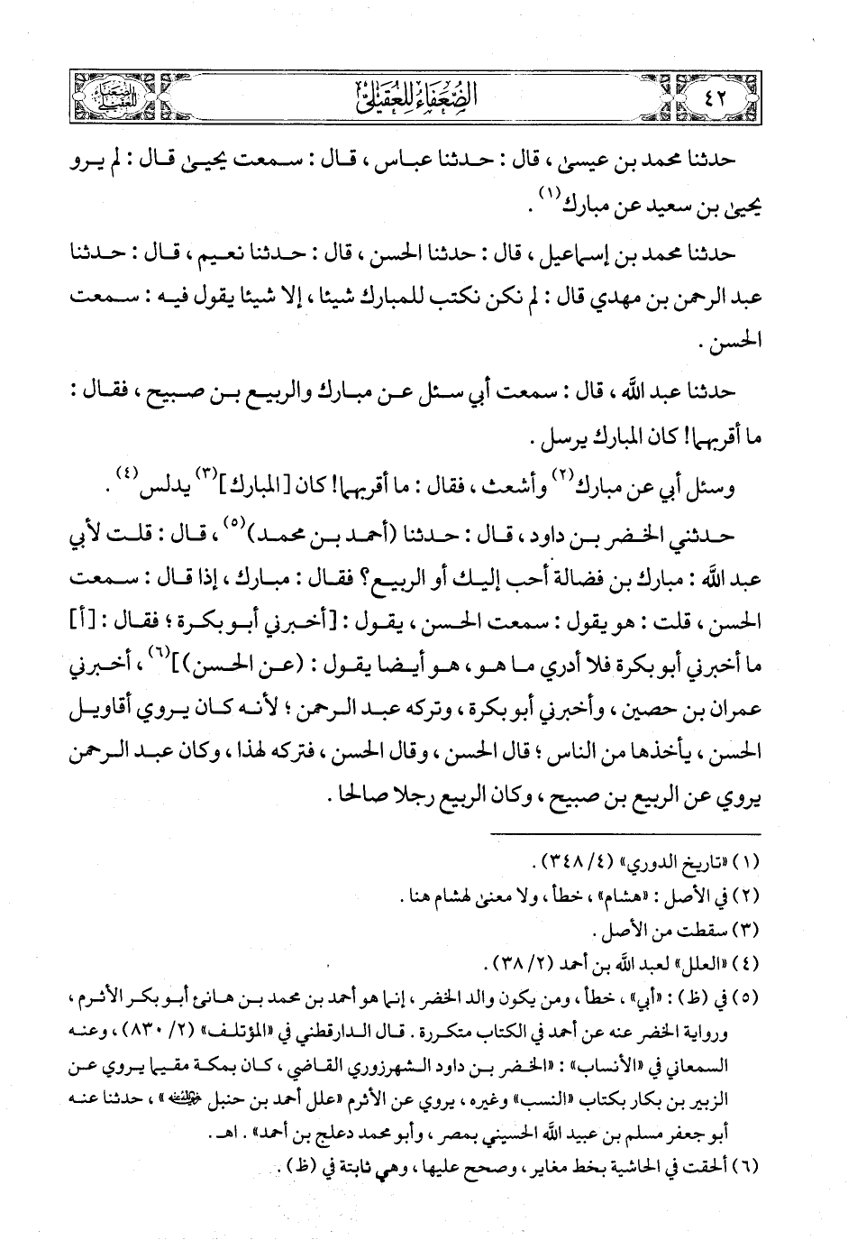 حدثنا محمد بن إسماعيل، قال: حدثنا الحسن، قال: حدثنا نعيم، قال: حدثنا عبد الرحمن بن مهدي قال: لم نكن نكتب للمبارك شيئا، إلا شيئا يقول فيه: سمعت الحسن.