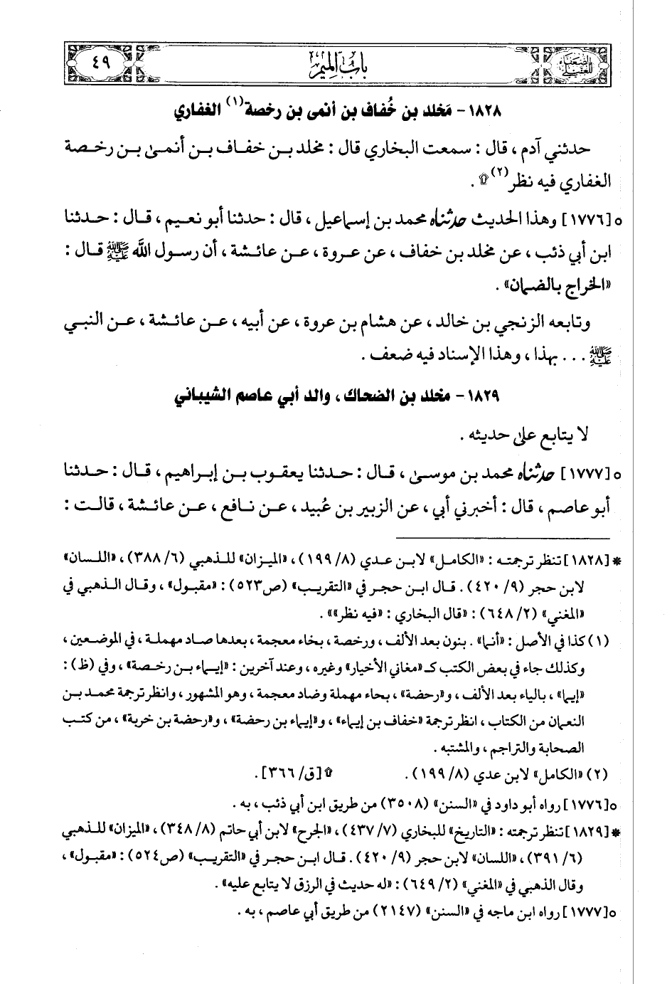 (1) * [1828] تنظر ترجمته: «الكامل» لابن عدي (8/ 199) , «الميزان» للذهبي (6/ 388) , «اللسان» لابن حجر (9/ 420). قال ابن حجر في «التقريب» (ص523): «مقبول» , وقال الذهبي في «المغني» (2/ 648): «قال البخاري: «فيه نظر»».