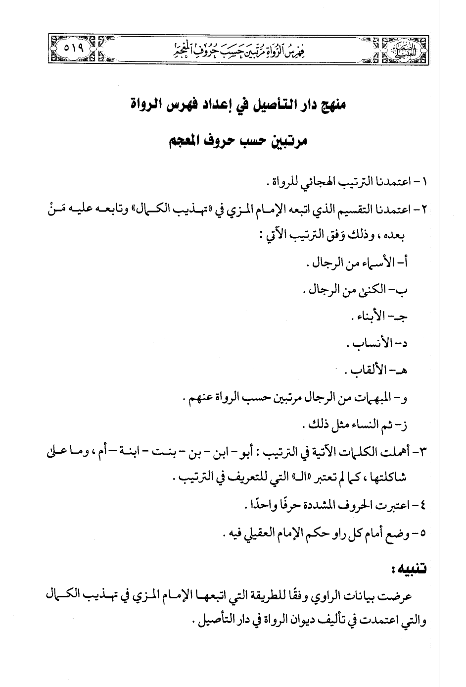 3 - أهملت الكلمات الآتية في الترتيب: أبو - ابن - بن - بنت - ابنة - أم، وما على شاكلتها، كما لم تعتبر «الـ» التي للتعريف في الترتيب.