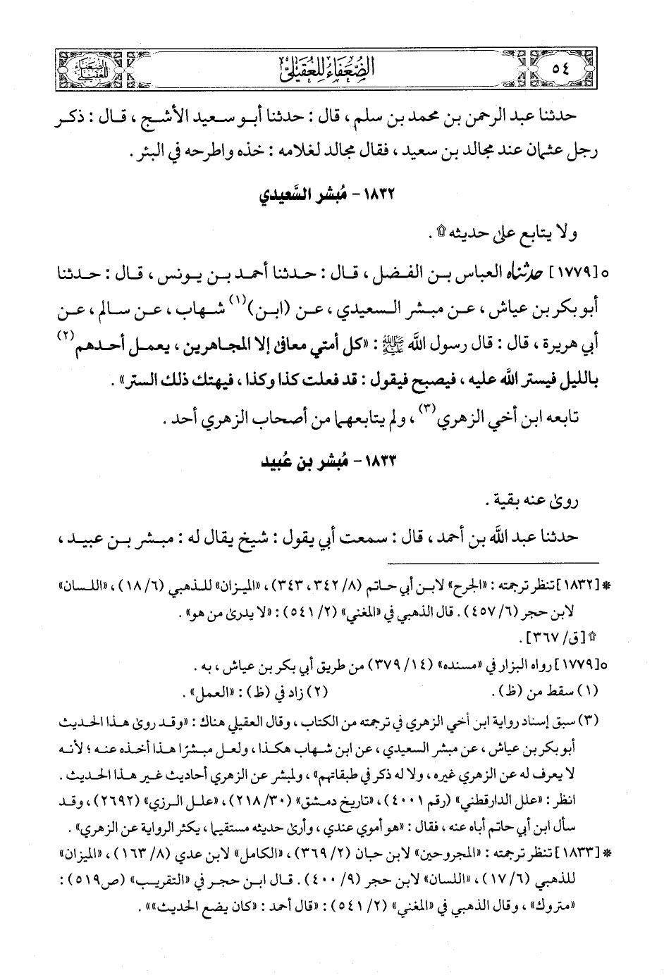 [1779] (3) حدثناه العباس بن الفضل، قال: حدثنا أحمد بن يونس، قال: حدثنا أبو بكر بن عياش، عن مبشر السعيدي، عن (ابن) (4) شهاب، عن سالم، عن أبي هريرة، قال: قال رسول الله صلى الله عليه وسلمع: «كل أمتي معافى إلا المجاهرين، يعمل أحدهم (5) بالليل فيستر الله عليه، فيصبح فيقول: قد فعلت كذا وكذا، فيهتك ذلك الستر».