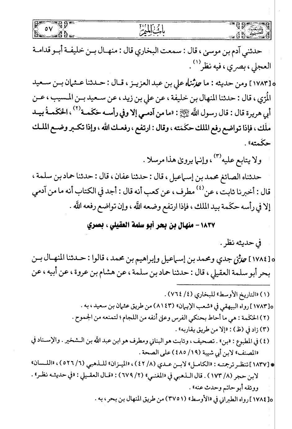 [1783] (2) ومن حديثه: ما حدثناه علي بن عبد العزيز، قال: حدثنا عثمان بن سعيد المُرّي، قال: حدثنا المنهال بن خليفة، عن علي بن زيد، عن سعيد بن المسيب، عن أبي هريرة قال: قال رسول الله صلى الله عليه وسلمع: «ما من آدمي إلا وفي رأسه حَكَمة (3)، الحَكَمةُ بيد ملَك، فإذا تواضع رفع الملك حكَمَته، وقال: ارتفع، رفعك الله، وإذا تكبر وضع الملك حكَمته».