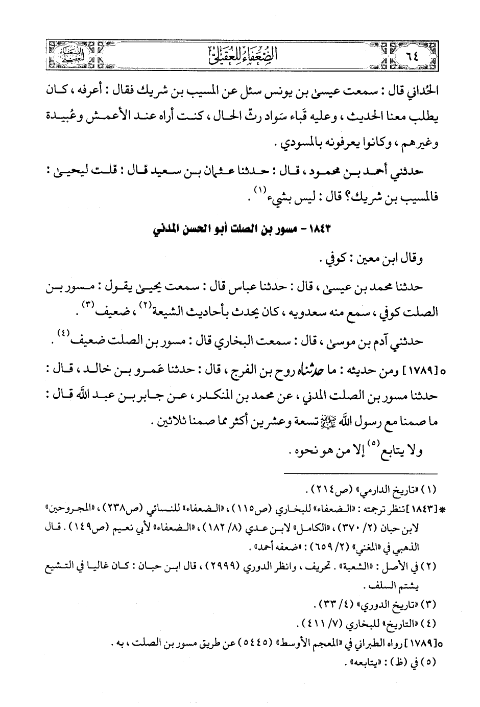 (2) * [1843] تنظر ترجمته: «الضعفاء» للبخاري (ص115) , «الضعفاء» للنسائي (ص238) , «المجروحين» لابن حبان (2/ 370) , «الكامل» لابن عدي (8/ 182) , «الضعفاء» لأبي نعيم (ص149). قال الذهبي في «المغني» (2/ 659): «ضعفه أحمد».