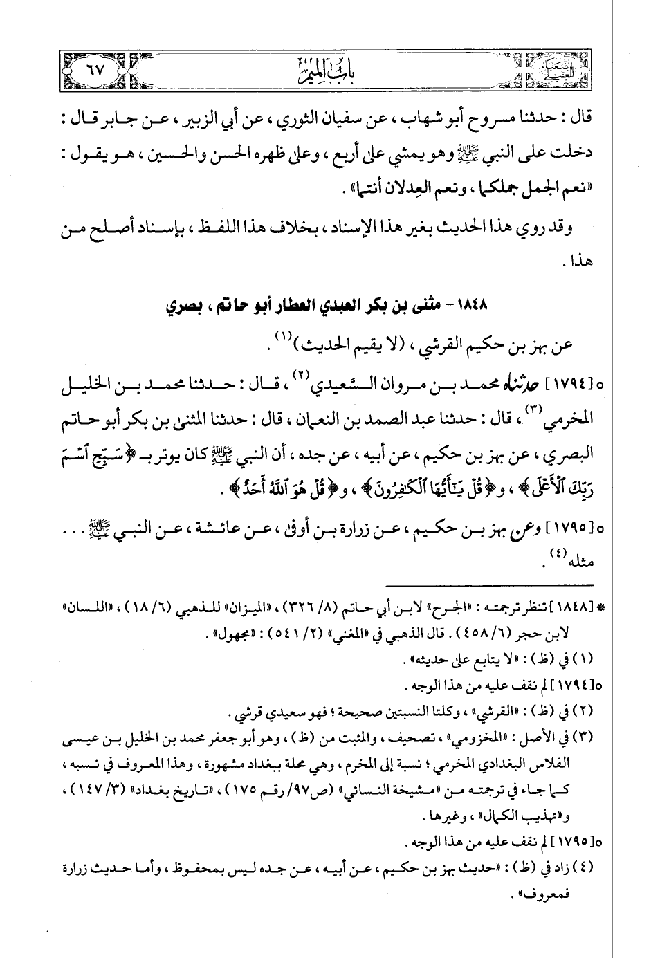 [1794] (3) حدثناه محمد بن مروان السَّعيدي (4)، قال: حدثنا محمد بن الخليل المخرمي (5)، قال: حدثنا عبد الصمد بن النعمان، قال: حدثنا المثنى بن بكر أبو حاتم البصري، عن بهز بن حكيم، عن أبيه، عن جده، أن النبي صلى الله عليه وسلمع كان يوتر بـ {سَبِّحِ اسْمَ رَبِّكَ الْأَعْلَى}، و {قُلْ يَاأَيُّهَا الْكَافِرُونَ}، و {قُلْ هُوَ اللَّهُ أَحَدٌ}.