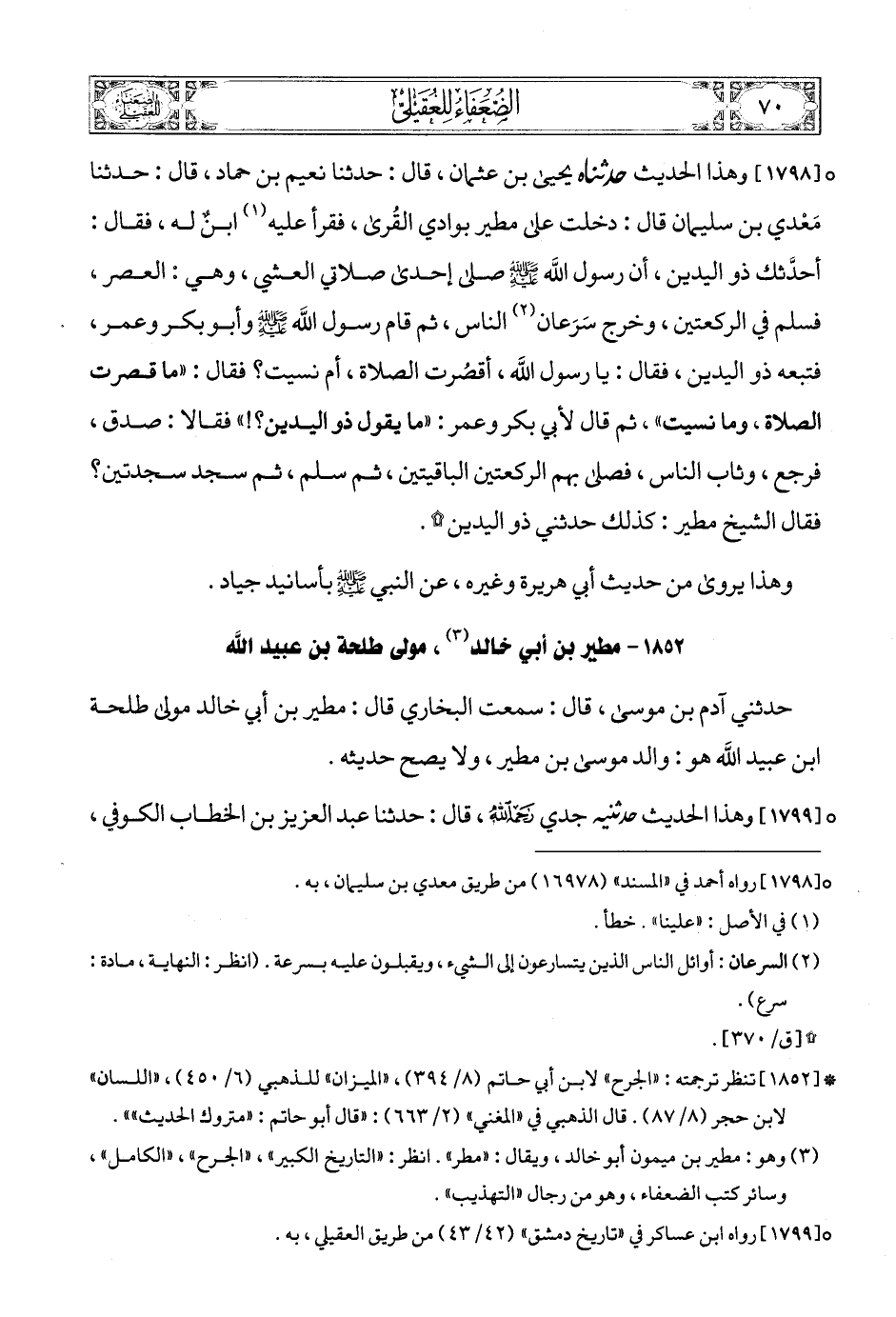 [1798] (1) وهذا الحديث حدثناه يحيى بن عثمان، قال: حدثنا نعيم بن حماد، قال: حدثنا مَعْدي بن سليمان قال: دخلت على مطير بوادي القُرى، فقرأ عليه (2) ابنٌ له، فقال: أحدَّثك ذو اليدين، أن رسول الله صلى الله عليه وسلمع صلى إحدى صلاتي العشي، وهي: العصر، فسلم في الركعتين، وخرج سَرَعان (3) الناس، ثم قام رسول الله صلى الله عليه وسلمع وأبو بكر وعمر، فتبعه ذو اليدين، فقال: يا رسول الله، أقصُرت الصلاة، أم نسيت؟ فقال: «ما قصرت الصلاة، وما نسيت»، ثم قال لأبي بكر وعمر: «ما يقول ذو اليدين؟!» فقالا: صدق، فرجع، وثاب الناس، فصلى بهم الركعتين الباقيتين، ثم سلم، ثم سجد سجدتين؟ فقال الشيخ مطير: كذلك حدثني ذو اليدين (4) ?.