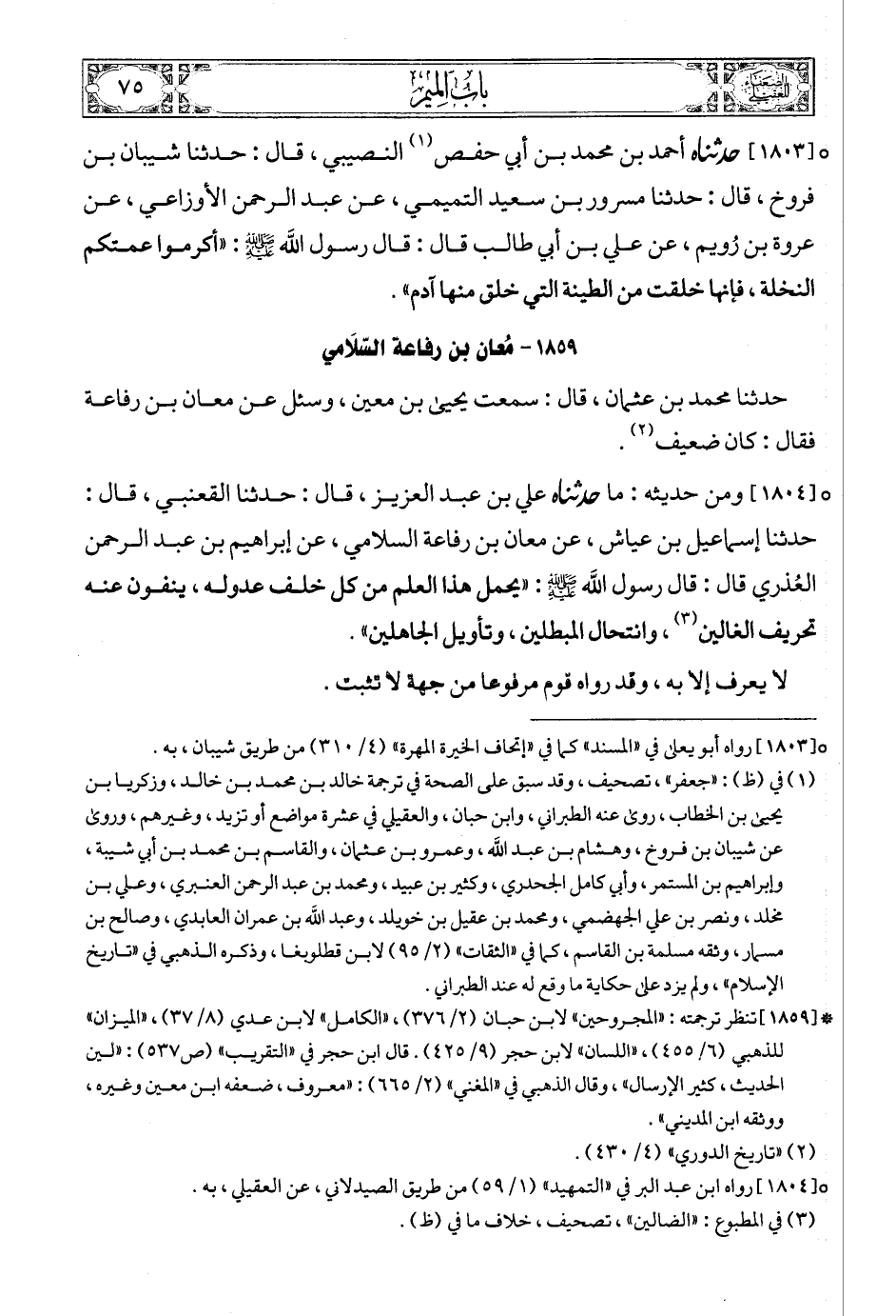 [1803] (1) حدثناه أحمد بن محمد بن أبي حفص (2) النصيبي، قال: حدثنا شيبان بن فروخ، قال: حدثنا مسرور بن سعيد التميمي، عن عبد الرحمن الأوزاعي، عن عروة بن رُويم، عن علي بن أبي طالب قال: قال رسول الله صلى الله عليه وسلمع: «أكرموا عمتكم النخلة، فإنها خلقت من الطينة التي خلق منها آدم».