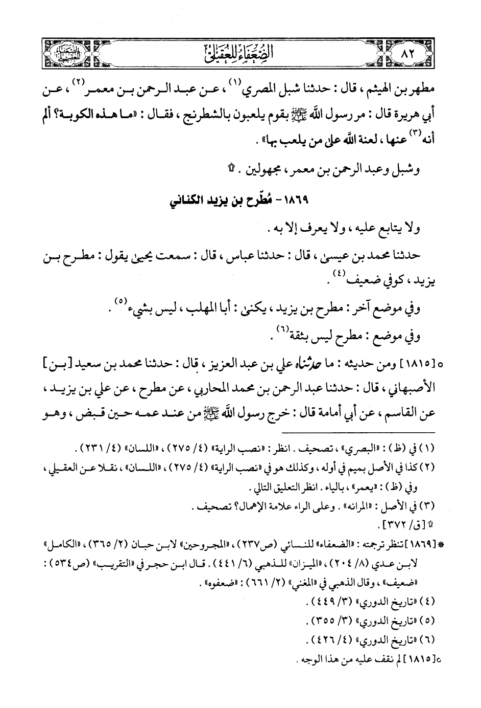 (5) * [1869] تنظر ترجمته: «الضعفاء» للنسائي (ص237) , «المجروحين» لابن حبان (2/ 365) , «الكامل» لابن عدي (8/ 204) , «الميزان» للذهبي (6/ 441). قال ابن حجر في «التقريب» (ص534): «ضعيف» , وقال الذهبي في «المغني» (2/ 661): «ضعفوه».