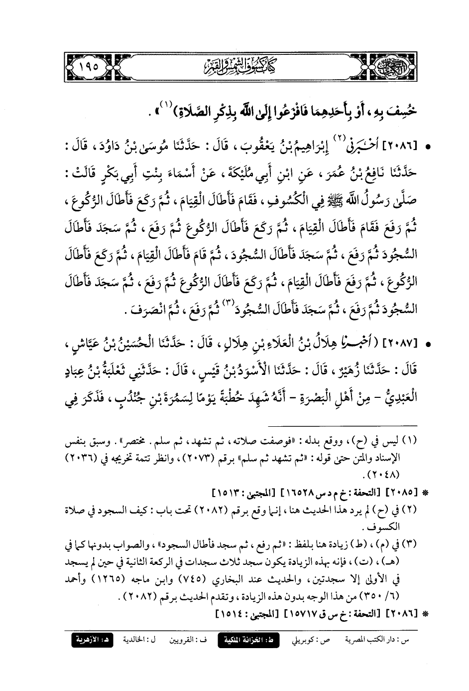 2086- أَخبَرني إِبرَاهِيمُ بنُ يَعقُوبَ، قَالَ: حَدثنا مُوسَى بنُ دَاوُدَ، قَالَ: حَدثنا نَافِعُ بنُ عُمَرَ، عَنِ ابنِ أَبِي مُلَيْكَةَ، عَنْ أَسْمَاءَ بِنْتِ أَبِي بَكْرٍ، قَالَتْ: صَلَّى رَسُولُ اللهِ صَلى الله عَليه وسَلم فِي الكُسُوفِ، فَقَامَ فَأَطَالَ القِيَامَ، ثُمَّ رَكَعَ فَأَطَالَ الرُّكُوعَ، ثُمَّ رَفَعَ فَقَامَ فَأَطَالَ القِيَامَ، ثُمَّ رَكَعَ فَأَطَالَ الرُّكُوعَ، ثُمَّ رَفَعَ، ثُمَّ سَجَدَ فَأَطَالَ السُّجُودَ، ثُمَّ رَفَعَ، ثُمَّ سَجَدَ فَأَطَالَ السُّجُودَ، ثُمَّ قَامَ فَأَطَالَ القِيَامَ، ثُمَّ رَكَعَ فَأَطَالَ الرُّكُوعَ، ثُمَّ رَفَعَ فَأَطَالَ القِيَامَ، ثُمَّ رَكَعَ فَأَطَالَ الرُّكُوعَ، ثُمَّ رَفَعَ، ثُمَّ سَجَدَ فَأَطَالَ السُّجُودَ، ثُمَّ رَفَعَ، ثُمَّ سَجَدَ فَأَطَالَ السُّجُودَ، ثُمَّ رَفَعَ، ثُمَّ انْصَرَفَ.