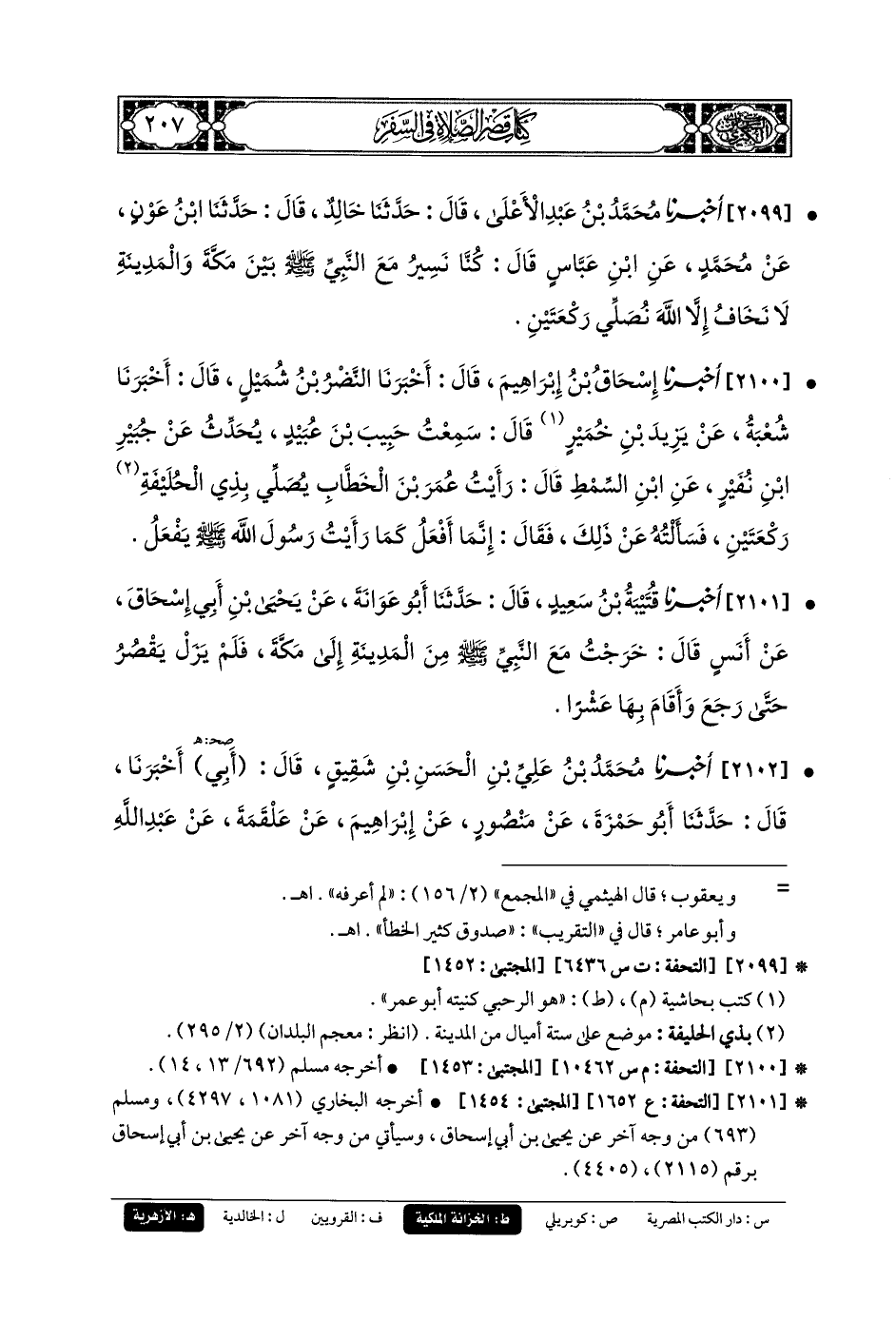 2099- أَخبَرنا مُحَمدُ بنُ عَبدِ الأَعْلَى، قَالَ: حَدثنا خَالِدٌ، قَالَ: حَدثنا ابنُ عَوْنٍ، عَنْ مُحَمدٍ، عَنِ ابنِ عَبَّاسٍ، قَالَ: كُنَّا نَسِيرُ مَعَ النَّبِيِّ صَلى الله عَليه وسَلم بَيْنَ مَكَّةَ وَالمَدِينَةِ لاَ نَخَافُ إِلاَّ اللهَ نُصَلِّي رَكْعَتَيْنِ.