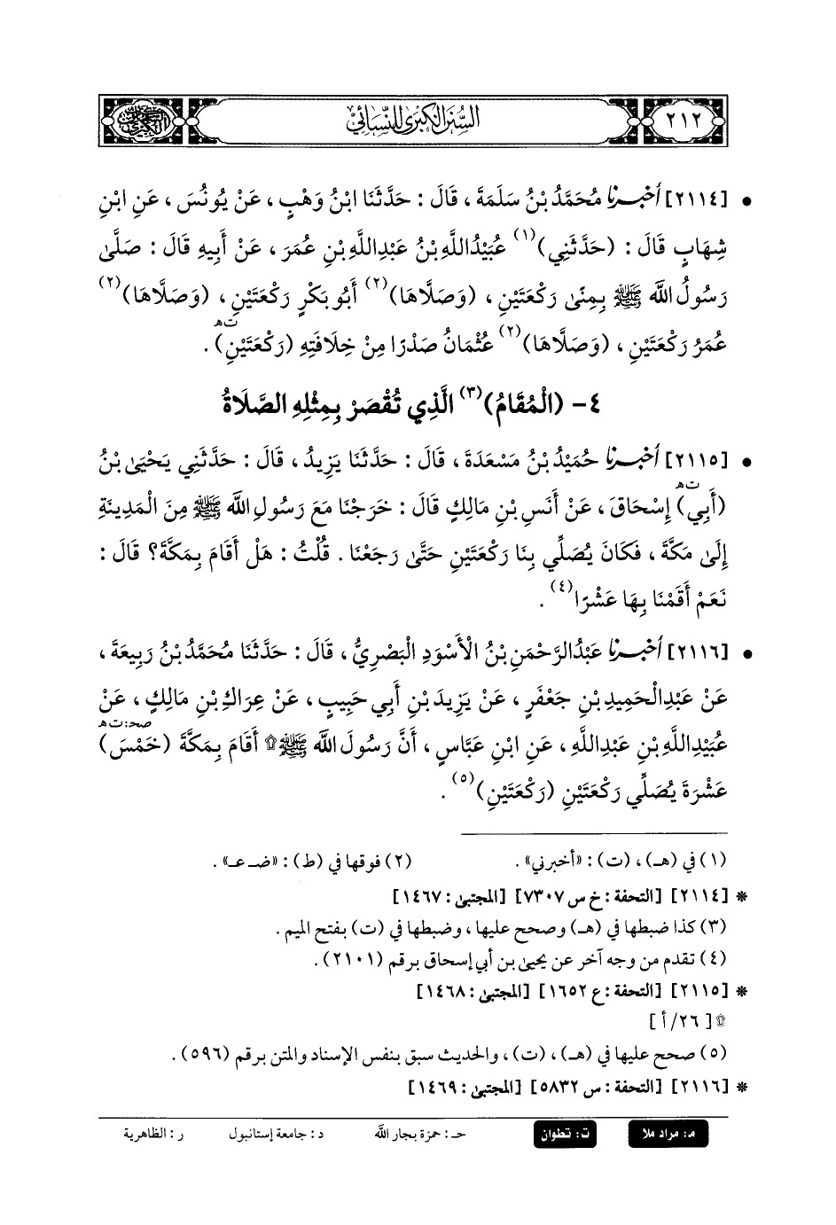2116- أَخبَرنا عَبدُ الرَّحْمَنِ بنُ الأَسْوَدِ البَصْرِيِّ، قَالَ: حَدثنا مُحَمدُ بنُ رَبِيعَةَ، عَنْ عَبدِ الحَمِيدِ بْنِ جَعفَرٍ، عَنْ يَزِيدَ بْنِ أَبِي حَبِيبٍ، عَنْ عِرَاكِ بْنِ مَالِكٍ، عَنْ عُبَيدِ اللهِ بْنِ عَبدِ اللهِ، عَنِ ابنِ عَبَّاسٍ، أَنَّ رَسُولَ اللهِ صَلى الله عَليه وسَلم أَقَامَ بِمَكَّةَ خَمْسَ عَشْرَةَ يُصَلِّي رَكْعَتَيْنِ رَكْعَتَيْنِ.