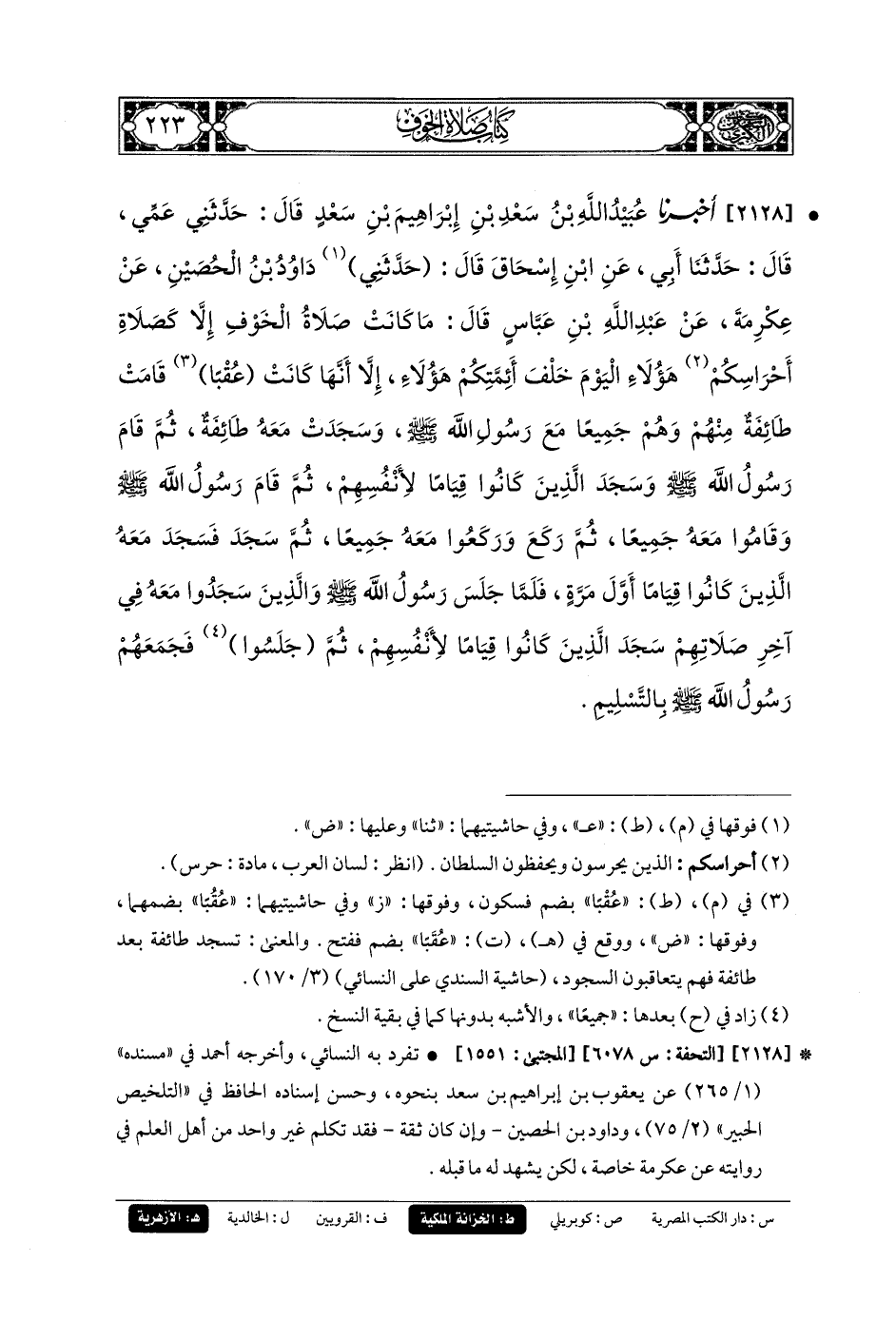 2128- أَخبَرنا عُبَيدُ اللهِ بنُ سَعْدِ بْنِ إِبرَاهِيمَ بْنِ سَعْدٍ، قَالَ: حَدَّثَنِي عَمِّي، قَالَ: حَدثنا أَبِي، عَنِ ابنِ إِسْحَاقَ، قَالَ: حَدَّثَنِي دَاوُدُ بنُ الحُصَيْنِ، عَنْ عِكْرِمَةَ، عَنْ عَبدِ اللهِ بْنِ عَبَّاسٍ، قَالَ: مَا كَانَتْ صَلاَةُ الخَوْفِ إِلاَّ كَصَلاَةِ أَحْرَاسِكُمْ هَؤُلاَءِ اليَوْمَ خَلْفَ أَئِمَّتِكُمْ هَؤُلاَءِ، إِلاَّ أَنَّهَا كَانَتْ عُقَبًا، قَامَتْ طَائِفَةٌ مِنْهُمْ وَهُمْ جَمِيعًا مَعَ رَسُولِ اللهِ صَلى الله عَليه وسَلم، وَسَجَدَتْ مَعَهُ طَائِفَةٌ، ثُمَّ قَامَ رَسُولُ اللهِ صَلى الله عَليه وسَلم، وَسَجَدَ الَّذِينَ كَانُوا قِيَامًا لأَنْفُسِهِمْ، ثُمَّ قَامَ رَسُولُ اللهِ صَلى الله عَليه وسَلم، وَقَامُوا مَعَهُ جَمِيعًا، ثُمَّ رَكَعَ، وَرَكَعُوا مَعَهُ جَمِيعًا، ثُمَّ سَجَدَ فَسَجَدَ مَعَهُ الَّذِينَ كَانُوا قِيَامًا أَوَّلَ مَرَّةٍ، فَلَمَّا جَلَسَ رَسُولُ اللهِ صَلى الله عَليه وسَلم، وَالَّذِينَ سَجَدُوا مَعَهُ فِي آخِرِ صَلاَتِهِمْ، سَجَدَ الَّذِينَ كَانُوا قِيَامًا لأَنْفُسِهِمْ، ثُمَّ جَلَسُوا، فَجَمَعَهُمْ رَسُولُ اللهِ صَلى الله عَليه وسَلم بِالتَّسْلِيمِ.